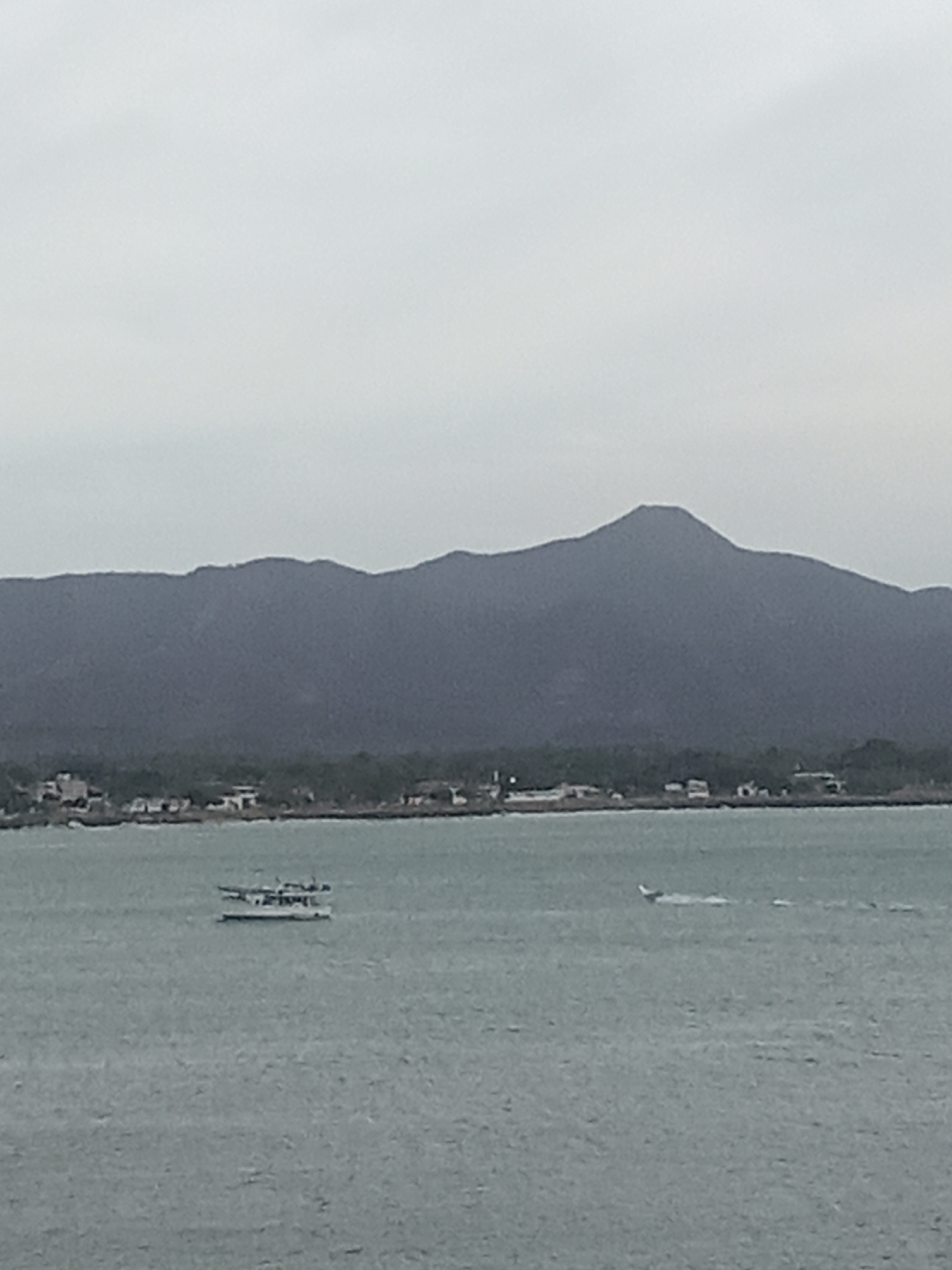 The image depicts a seascape under an overcast sky. In the foreground, two vessels are visible on the water. One appears to be a small boat with passengers, while the other is a seaplane or similar ai…read more