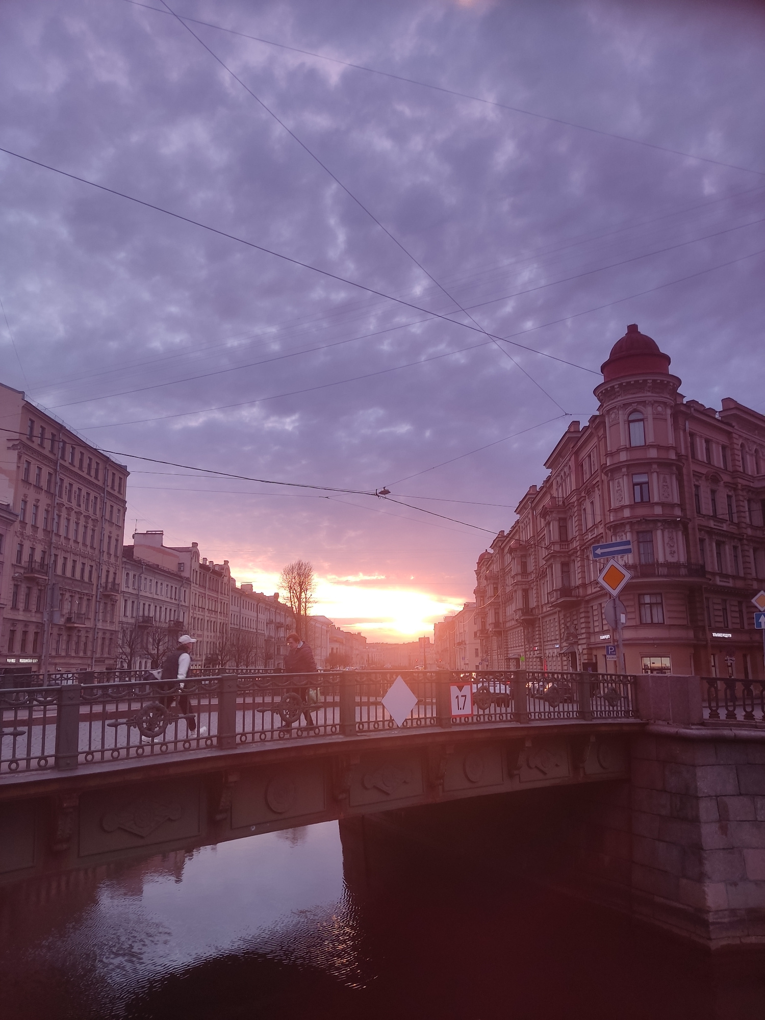 The image captures a cityscape in Saint Petersburg, Russia, viewed from a low angle. A bridge spans a waterway, with a glimpse of water reflecting the sky. The sky is filled with clouds, painted in hu…read more