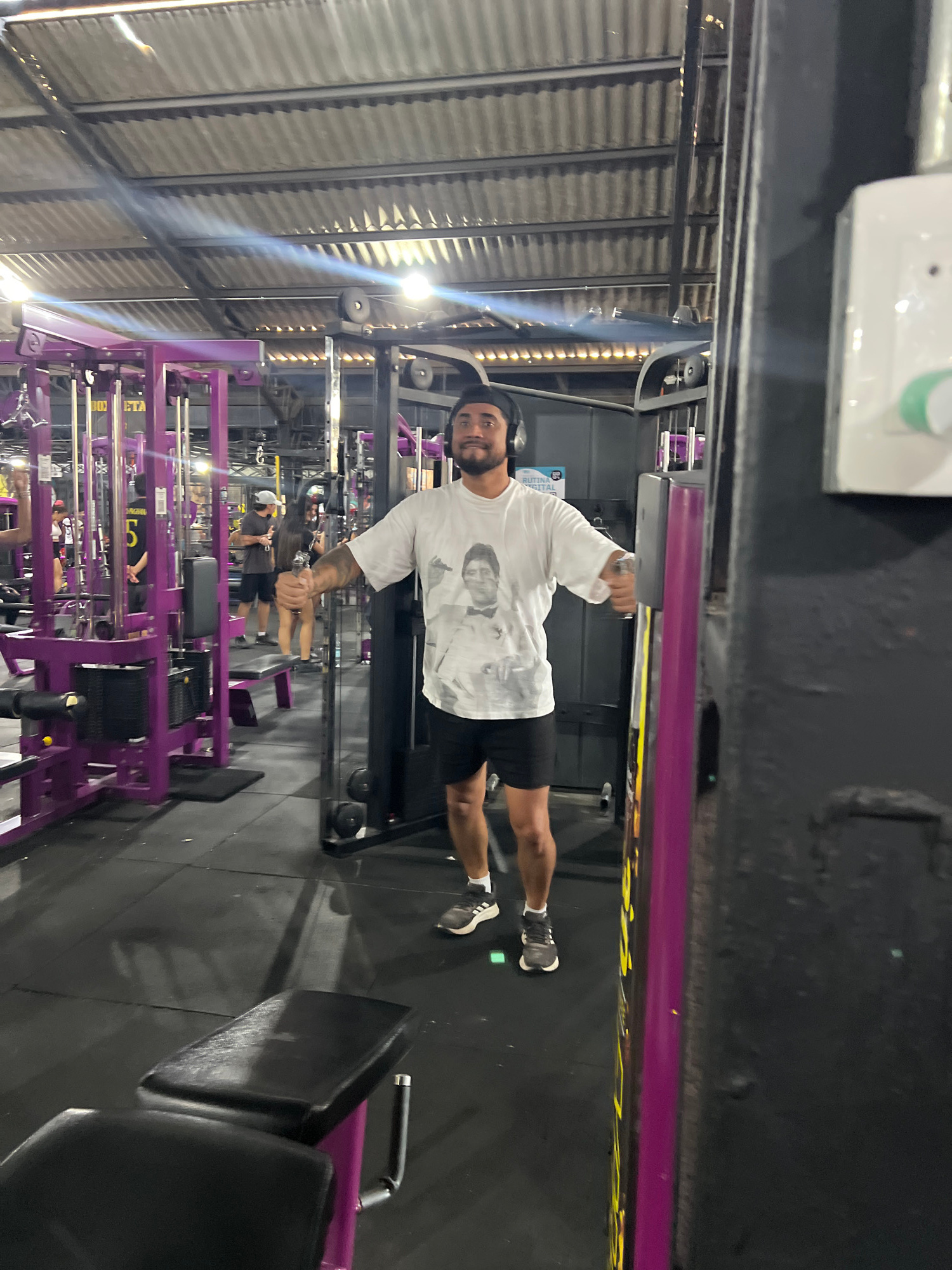 Arica, Chile: Interior view of a Planet Fitness gym, showing a man wearing a white t-shirt, black shorts and headphones working out on gym equipment. The gym has purple equipment and dark flooring. Ot…read more