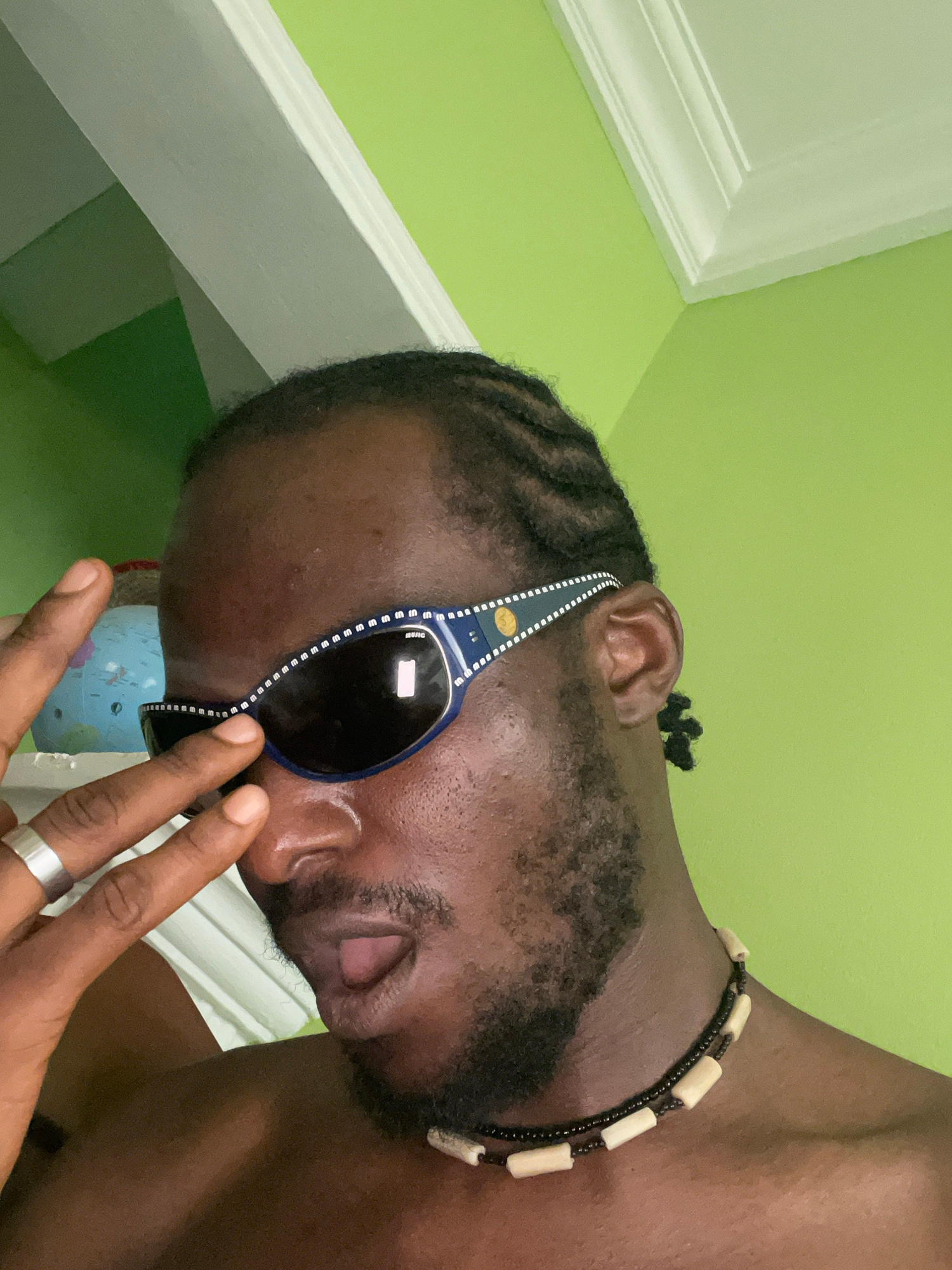 The image is a close-up, high-angle shot of a dark-skinned person wearing sunglasses and a beaded necklace. The person has short, braided hair and a beard. The environment appears to be indoors, with…read more