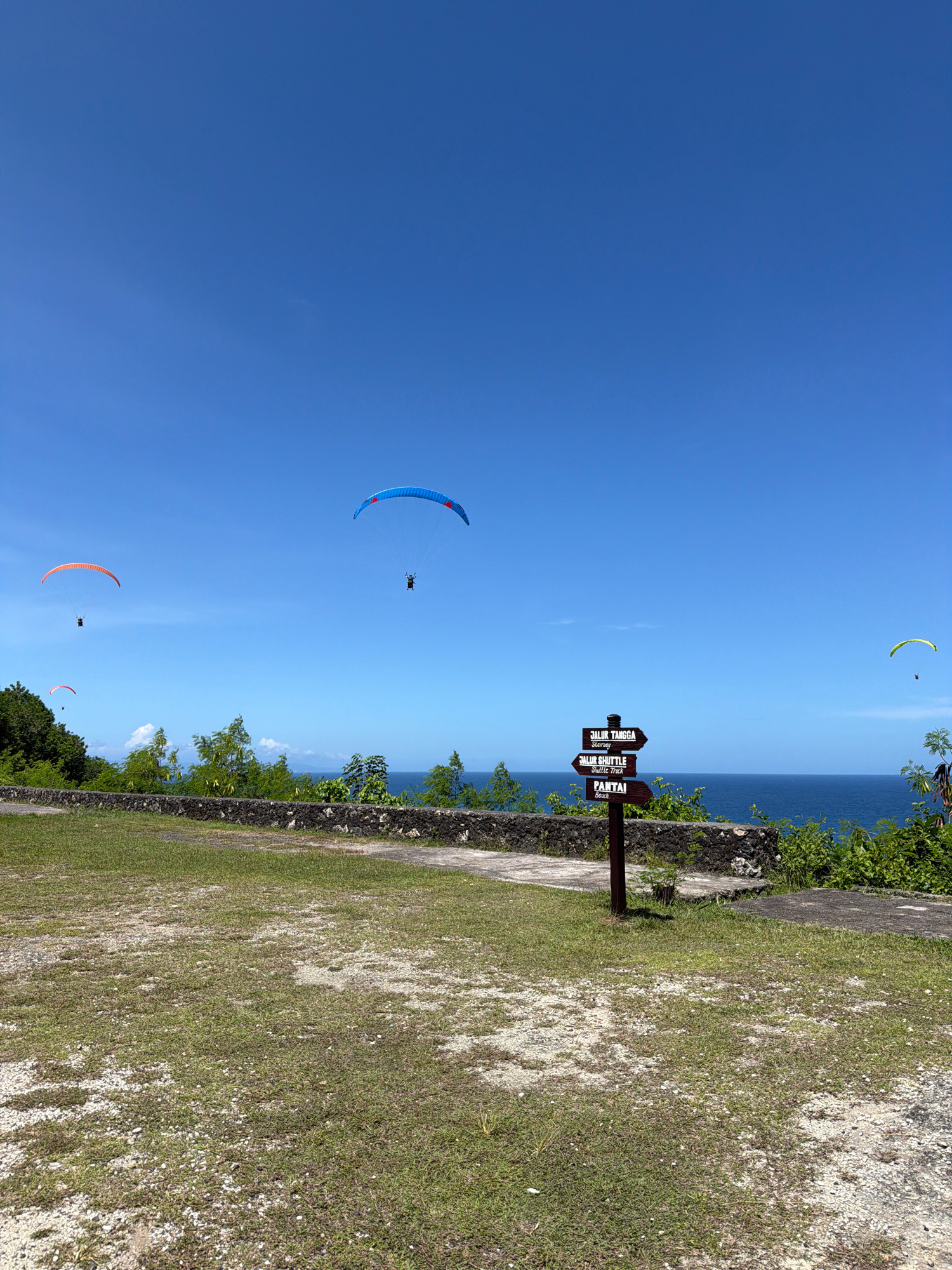 The image depicts a scene in Benoa, Indonesia, featuring paragliders in the sky. A brown wooden signpost stands near a grassy area, indicating directions to "Jalur Tangga," "Jalur Shuttle," and "Panta…read more