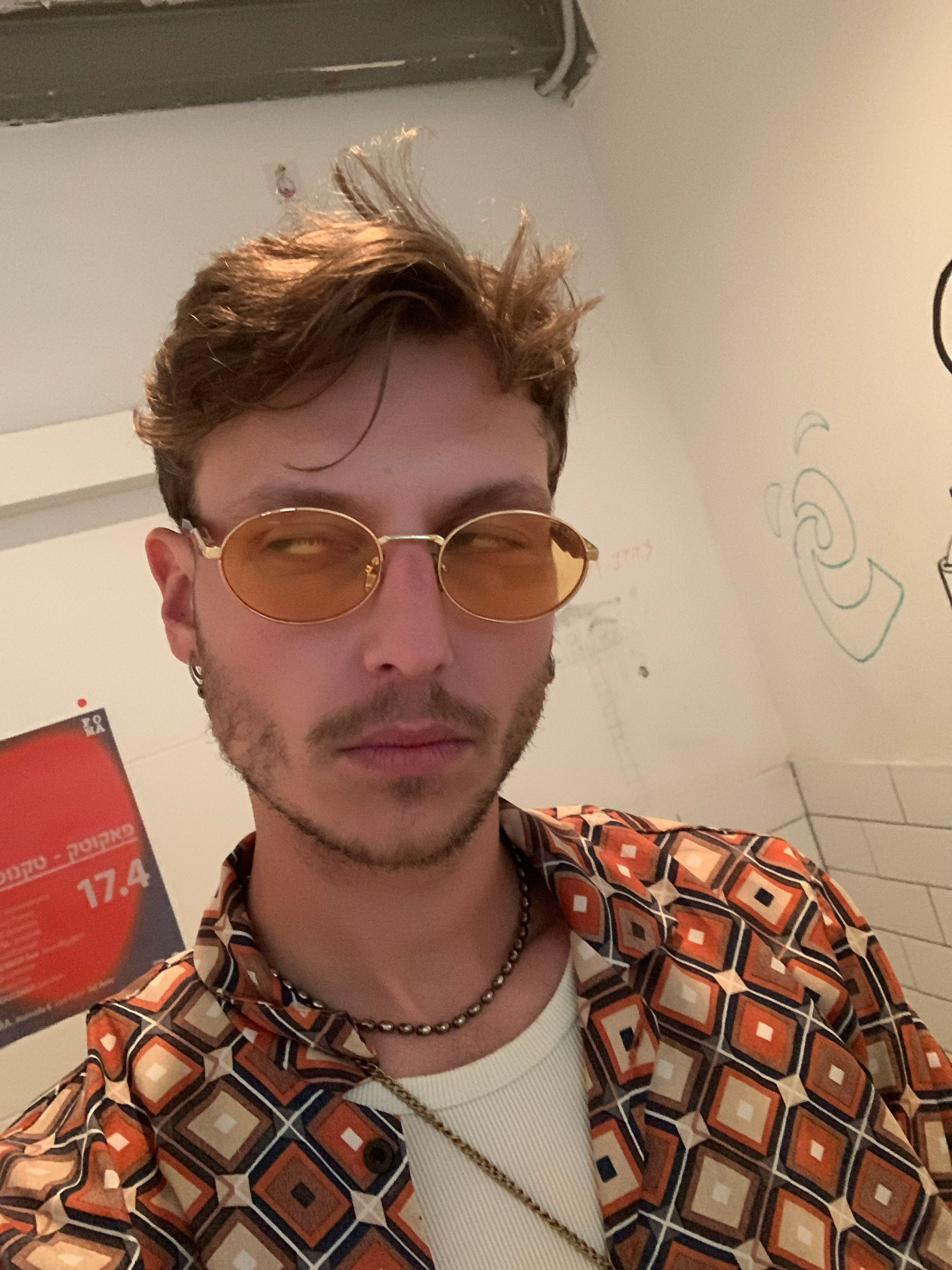 A portrait of a man with light brown hair and a trimmed beard, wearing round-frame sunglasses, a patterned shirt with orange, brown, and white squares, and two necklaces (one beaded, one a thin gold c…read more