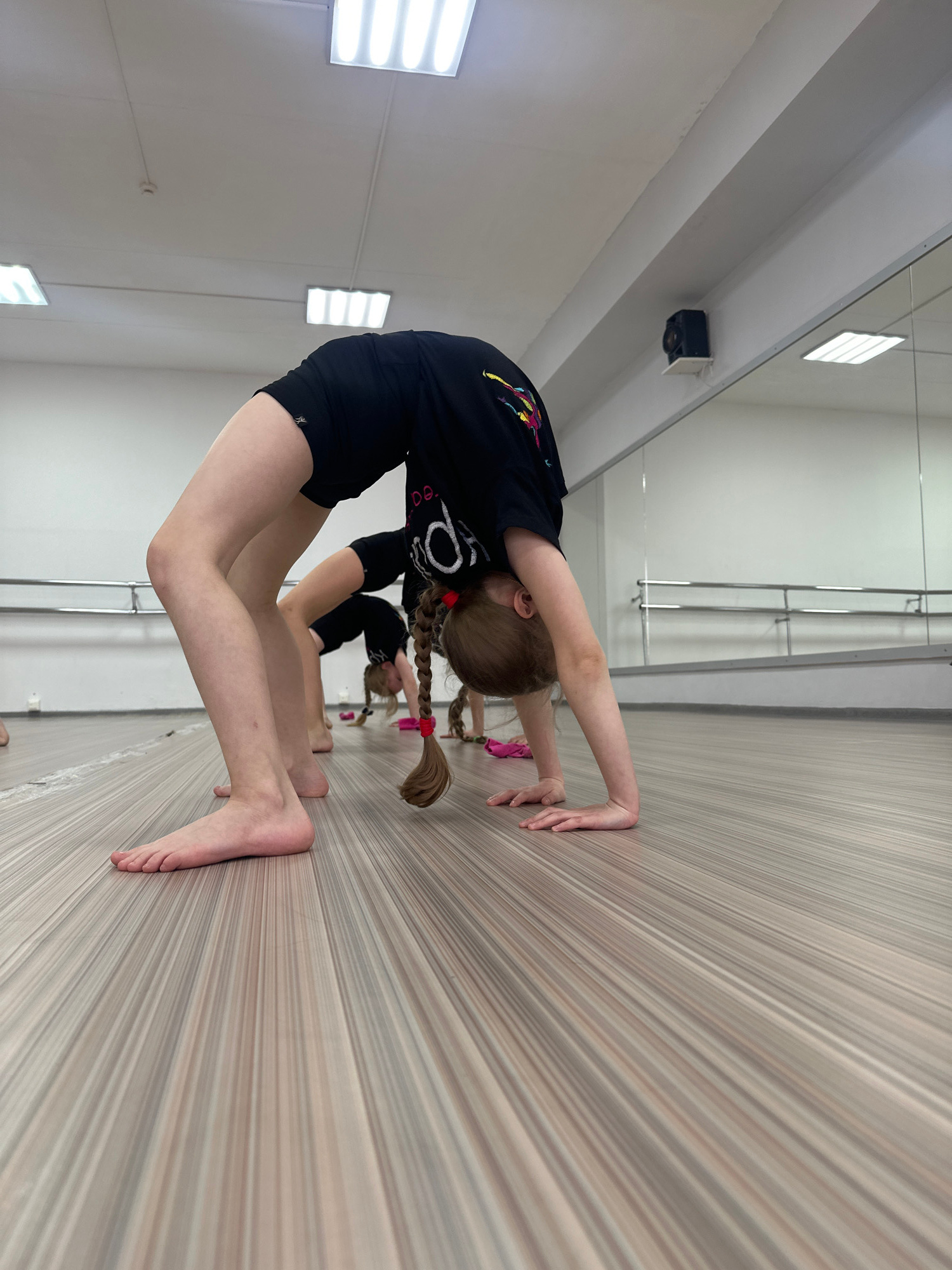 This image, rotated 90 degrees clockwise, captures two young girls performing a backbend stretch in an indoor studio in Votkinsk, Russia. The primary subject in the foreground is a girl with light br…read more
