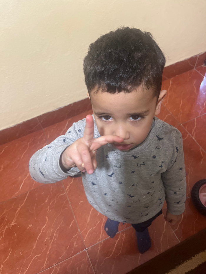 This image depicts a young male child indoors, located in Ouaouizert, Morocco. The child, with dark, short, curly hair and dark eyes, is positioned facing the camera from a slightly elevated angle. He…read more