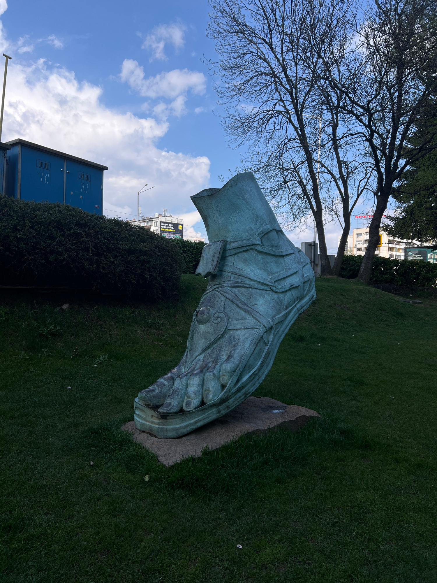 The image shows a bronze sculpture of a hand lying on a stone base, set on a green lawn. Behind the sculpture is a dense hedge and a blue building. In the background, buildings are visible, one with a…read more