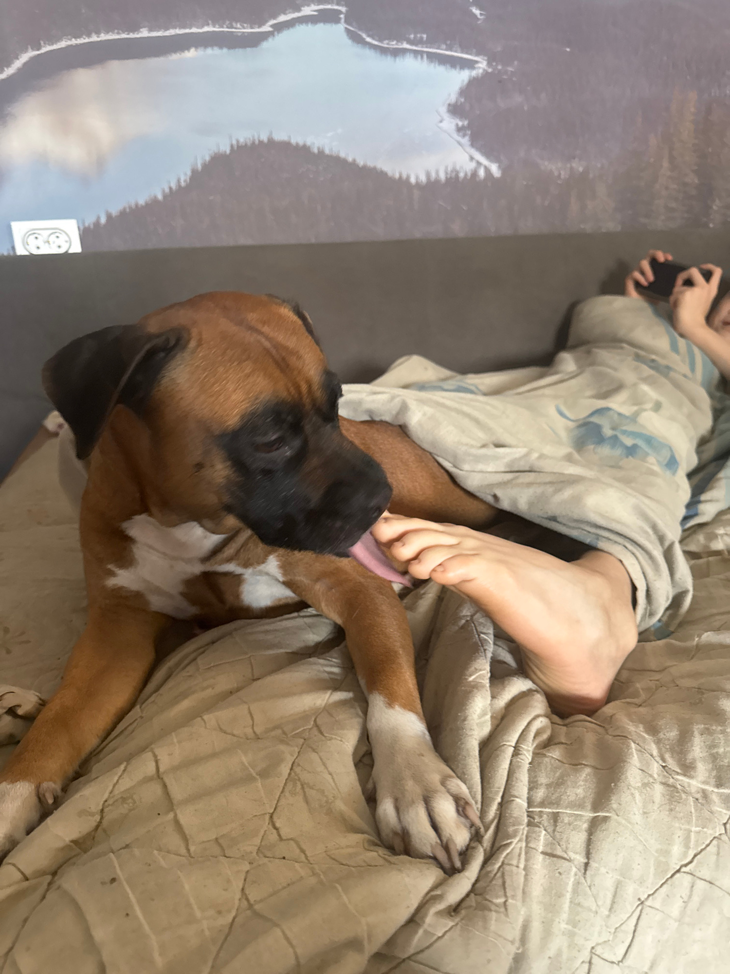 A tan and white Boxer dog lies on a beige and cream-colored quilted blanket, with its head near a human foot sticking out from under a blue and white floral patterned sheet. The dog's tongue is visibl…read more