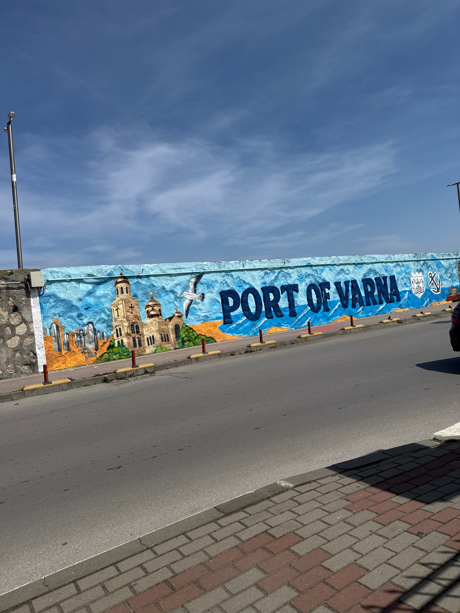 The image shows a mural along a street in Varna, Bulgaria. The mural is painted on a retaining wall or large concrete barrier. It features the words "PORT OF VARNA" in blue letters, along with an illustration of the Varna Cathedral, seagulls, and maritime symbols. The sky is visible above the mural, with a few clouds. The street and a sidewalk made of patterned bricks are adjacent to the mural. A light post is visible. | Open Wire