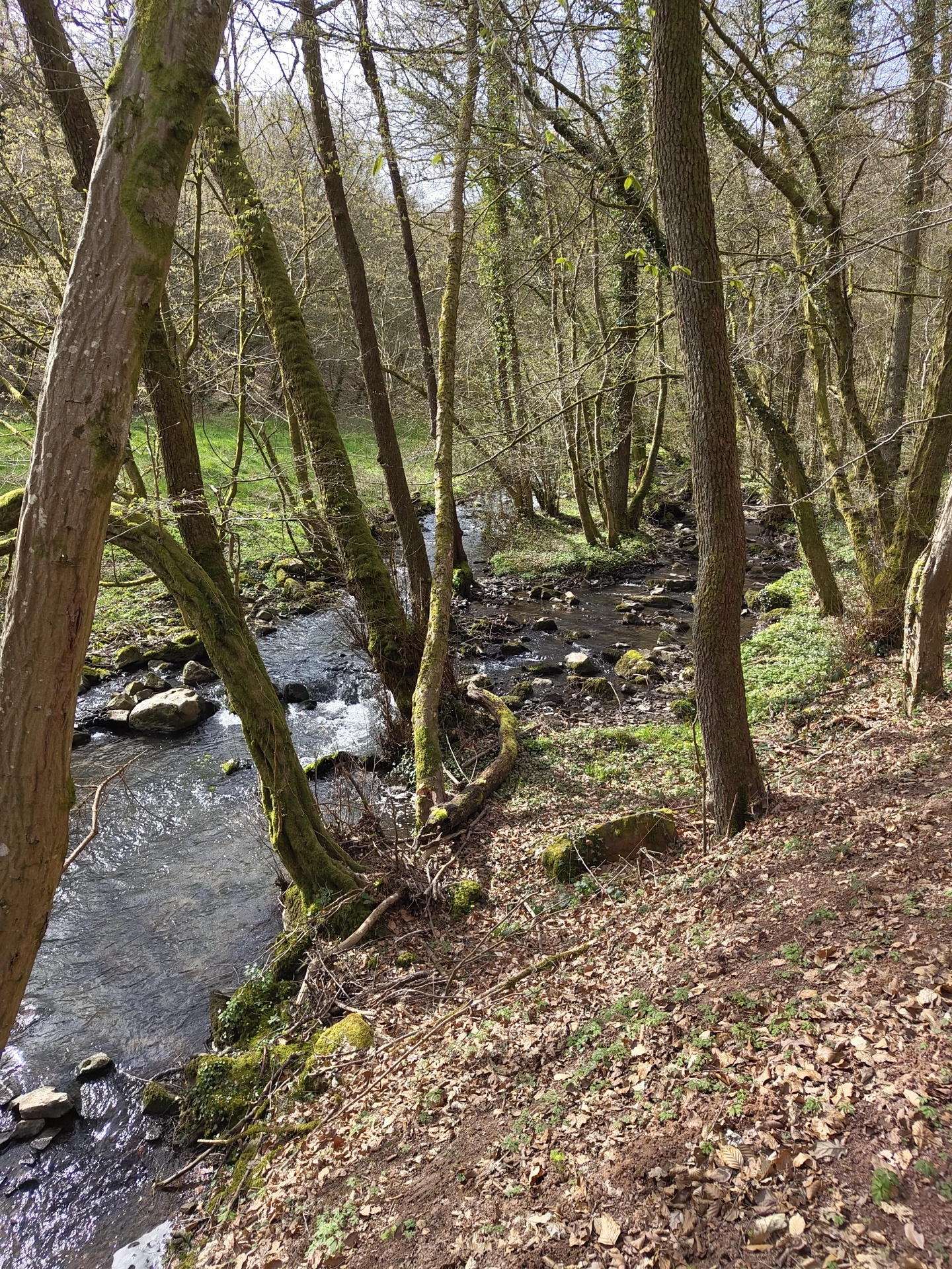 The image captures a stream flowing through a forest landscape, likely located near Mettlach, Germany. The stream is flanked by trees, many covered in moss, their branches reaching over the water. The…read more