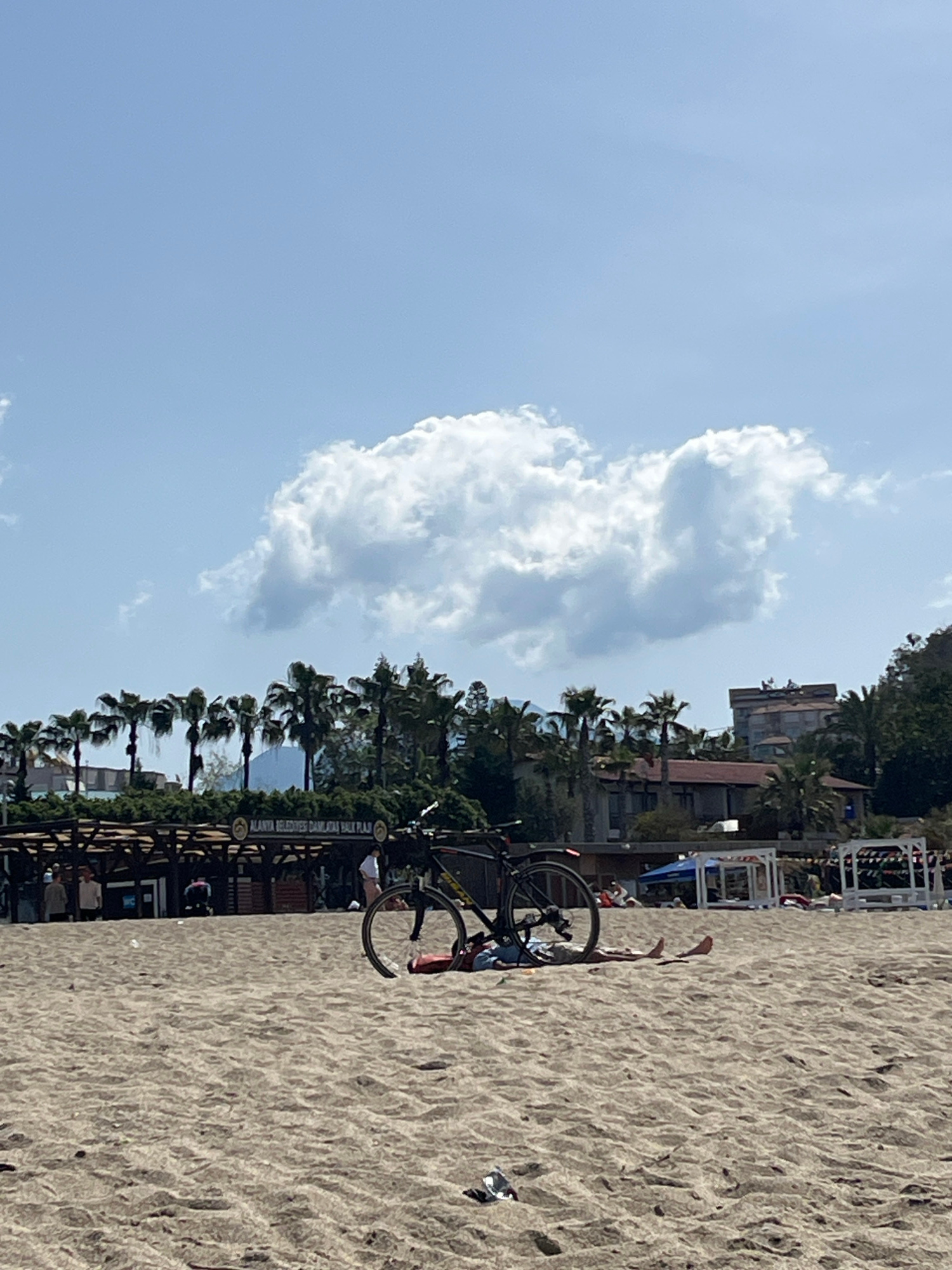 The scene is a beach in Alanya, Turkey, specifically on Damlataş Beach (indicated by a sign). The beach has light-colored sand. A bicycle is parked on the beach. A person is lying on the beach in the…read more