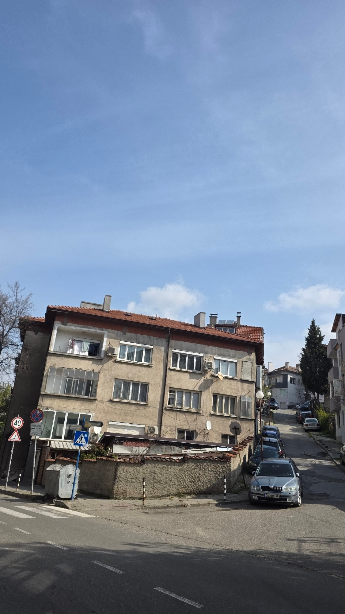 The image depicts a street scene in Blagoevgrad, Bulgaria. A three-story building with multiple windows, air conditioning units, and a red-tiled roof is the central feature. Adjacent to the building i…read more
