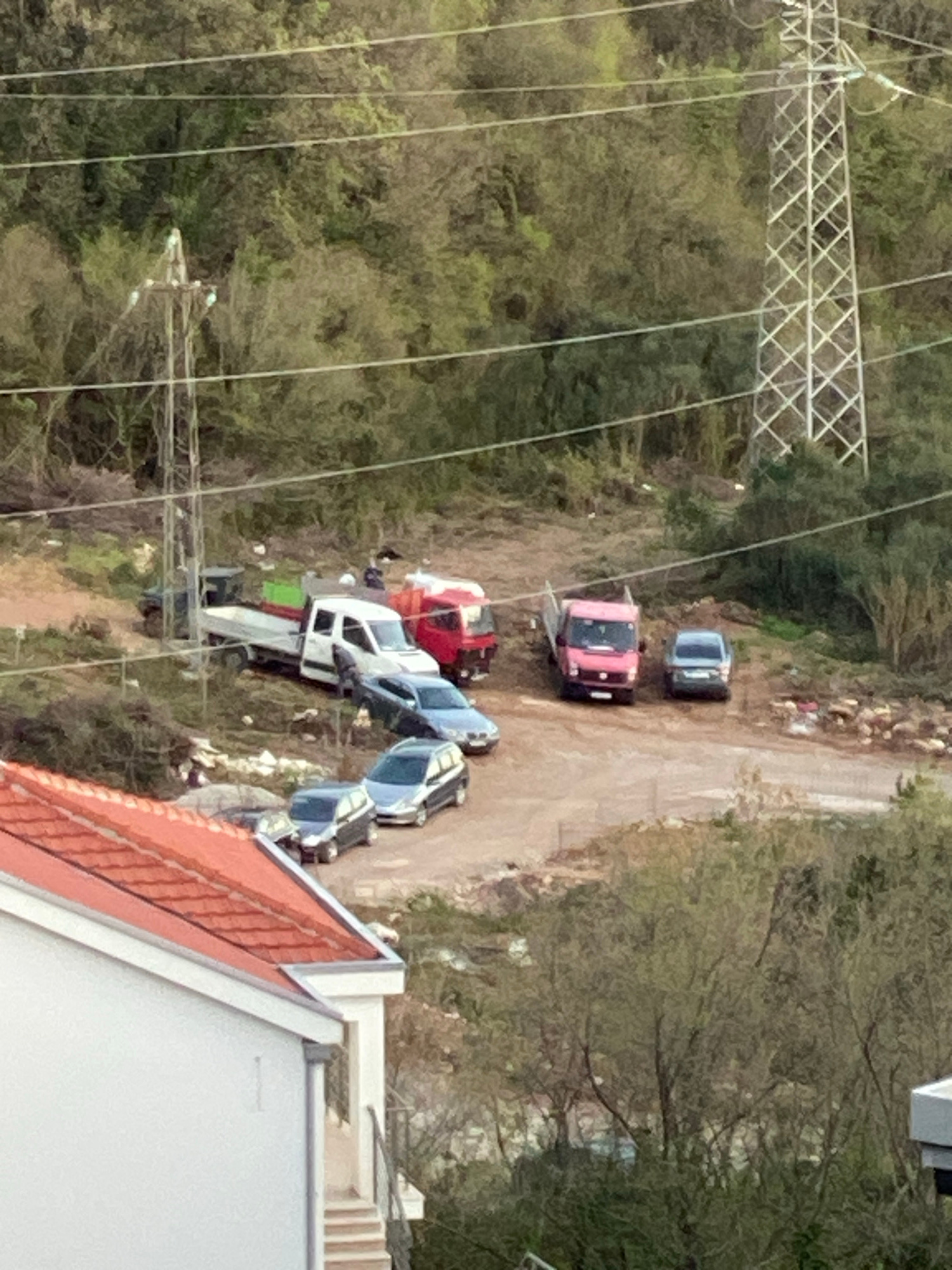 The image shows a clearing next to a dirt road near a wooded area, situated within the city of Budva, Montenegro. Several vehicles are parked in the clearing and along the dirt road, including two gre…read more