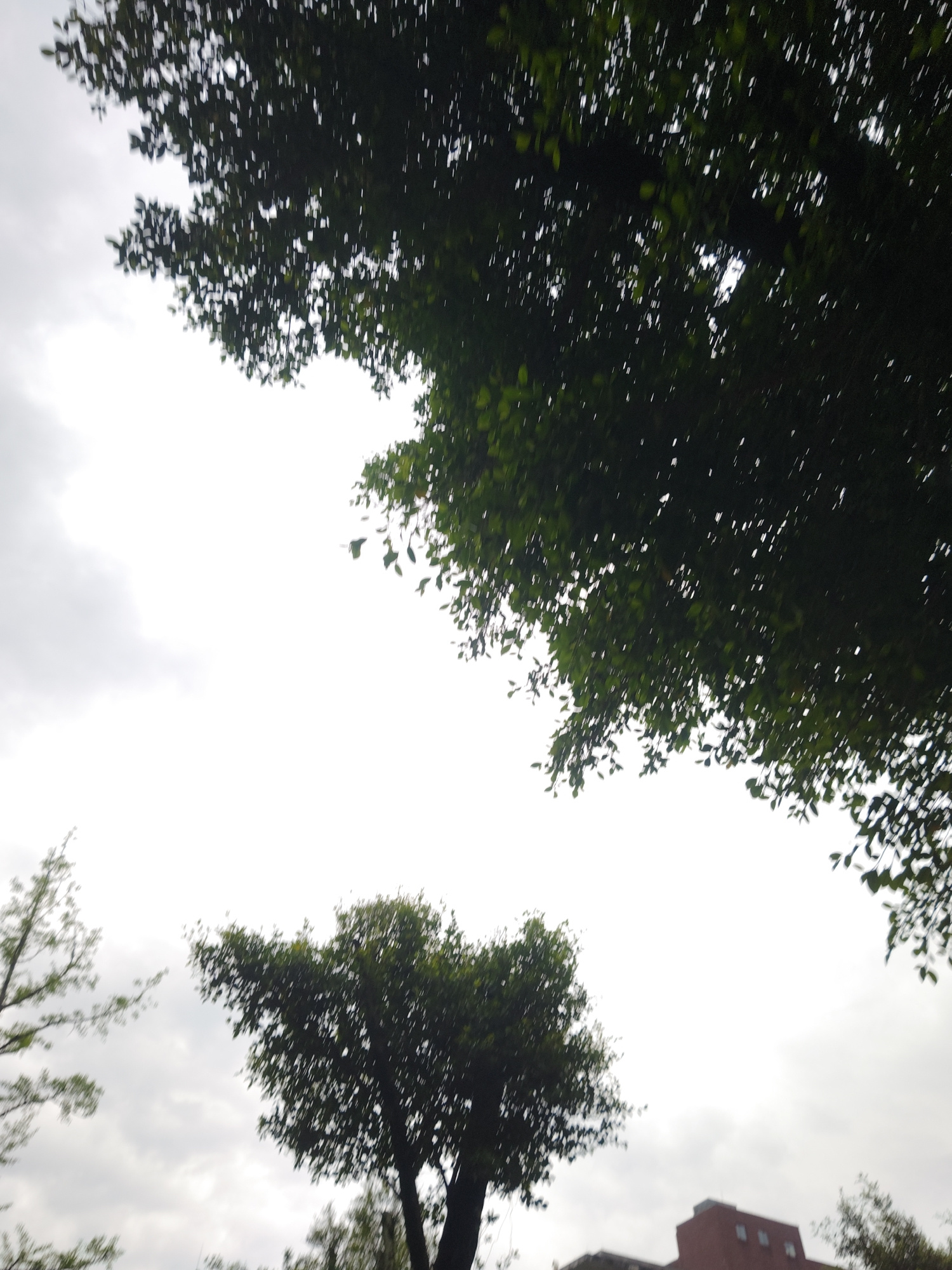 The image, taken from a low angle, features trees with dense green foliage filling the majority of the frame. The sky is visible in the gaps between the trees, appearing overcast with a pale white hue…read more