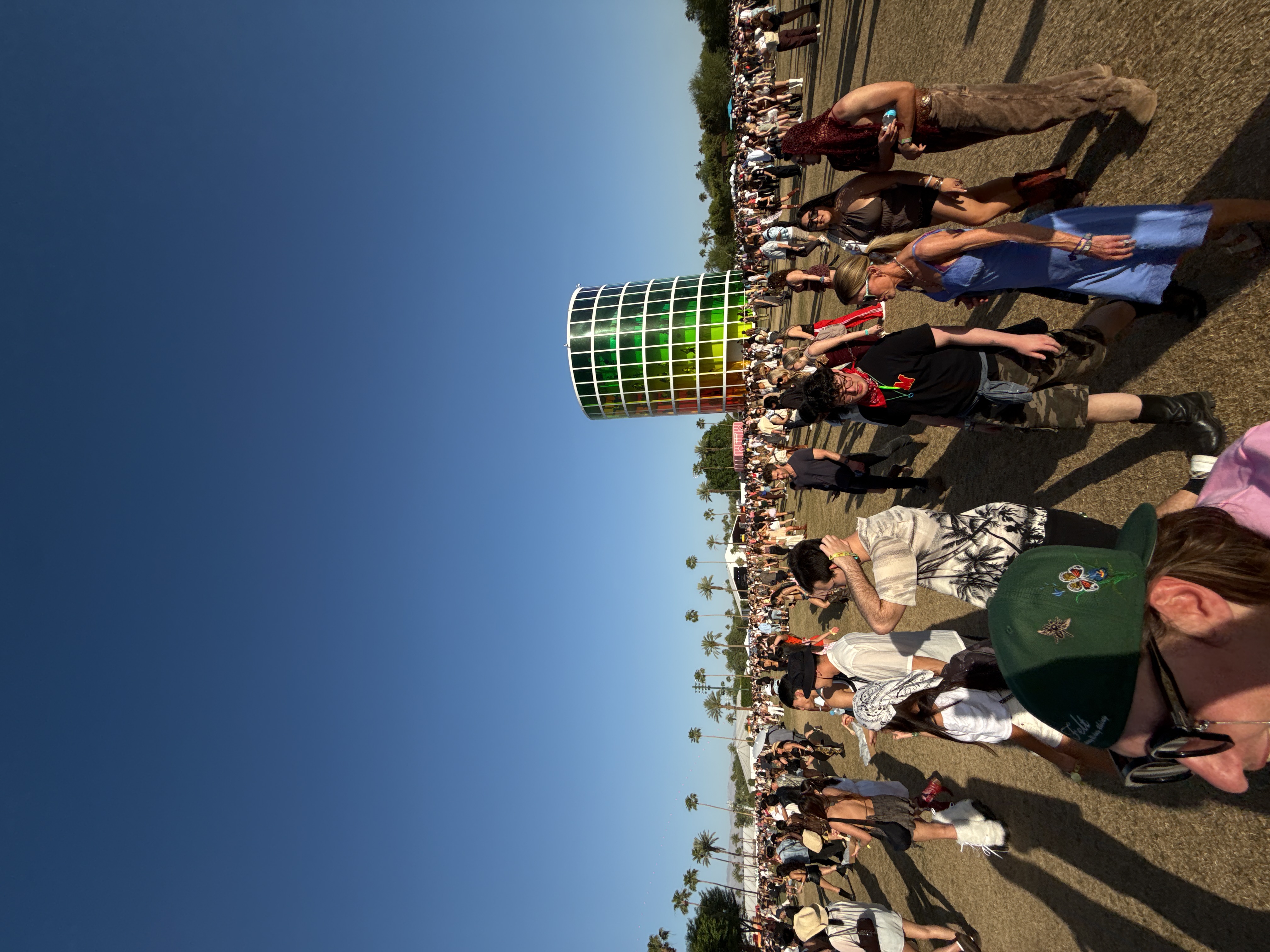 The image shows a large crowd of people gathered at what appears to be a festival or outdoor event, under a clear blue sky. In the background, there is a tall, cylindrical structure with a multicolore…read more