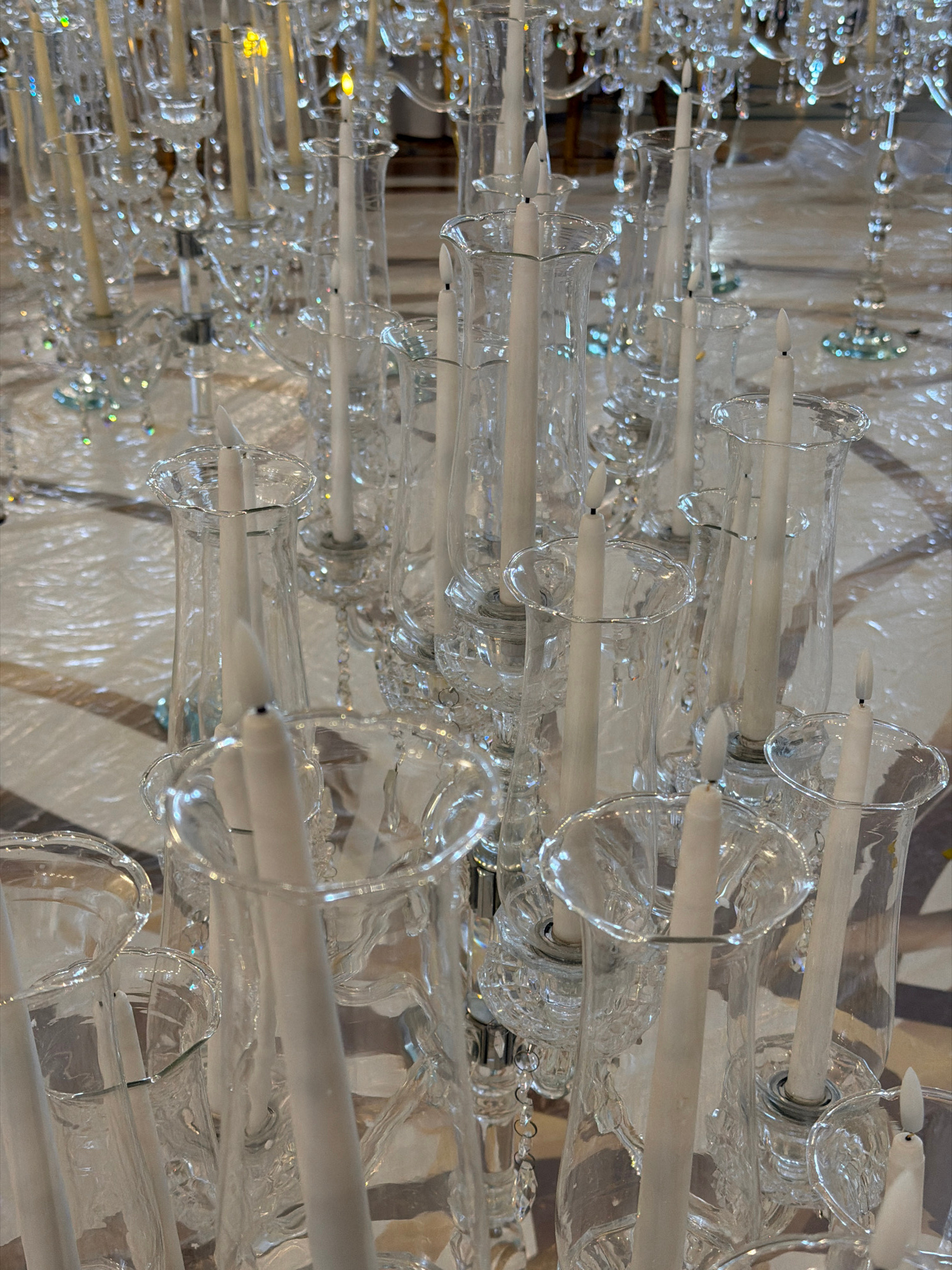 The image shows a chandelier in the city of Moscow, Russia. The chandelier is made of clear glass, and it is in a horizontal position. It has many long white candles. The background appears to be a fa…read more
