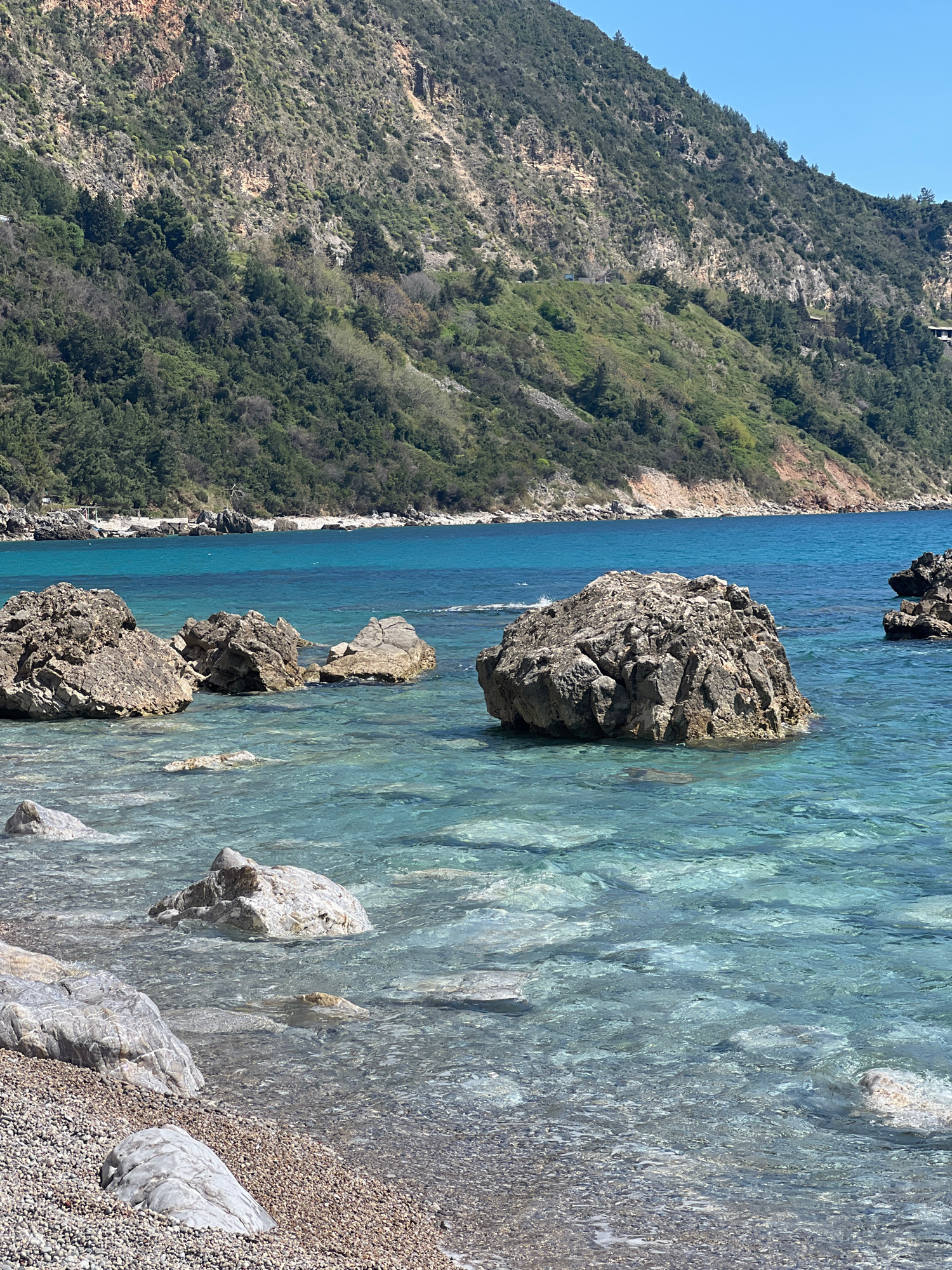 The image depicts a rocky coastline with clear turquoise water near Prijevor, Montenegro. A mountainside covered in green vegetation rises steeply on the left side of the frame. Several large, grey ro…read more