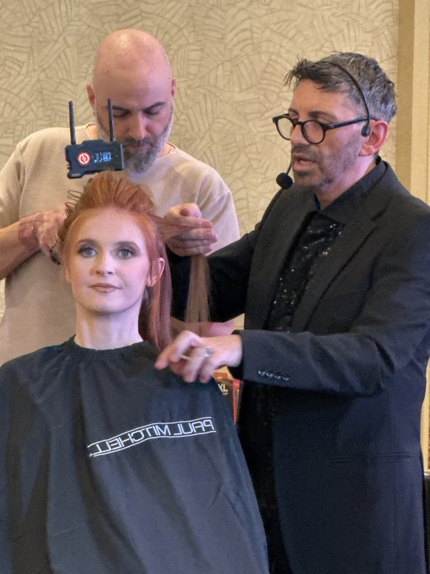 The image shows a woman with red hair, wearing a black cape with white text, receiving a haircut. One man in a black suit and glasses is cutting her hair, while another man in a tan shirt is holding t…read more