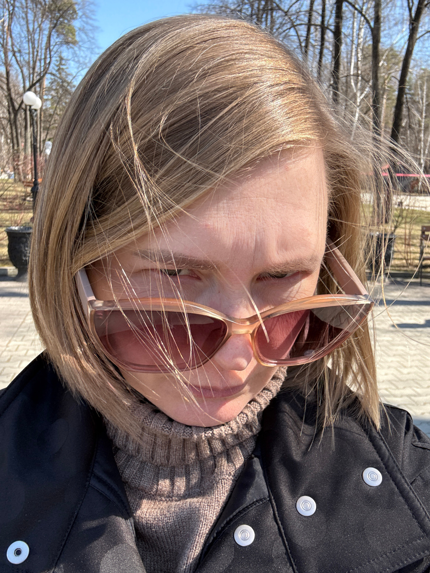 A person with light brown hair and wearing sunglasses is the primary subject of the image. They are also wearing a brown turtleneck sweater and a black coat with silver buttons. The background shows t…read more