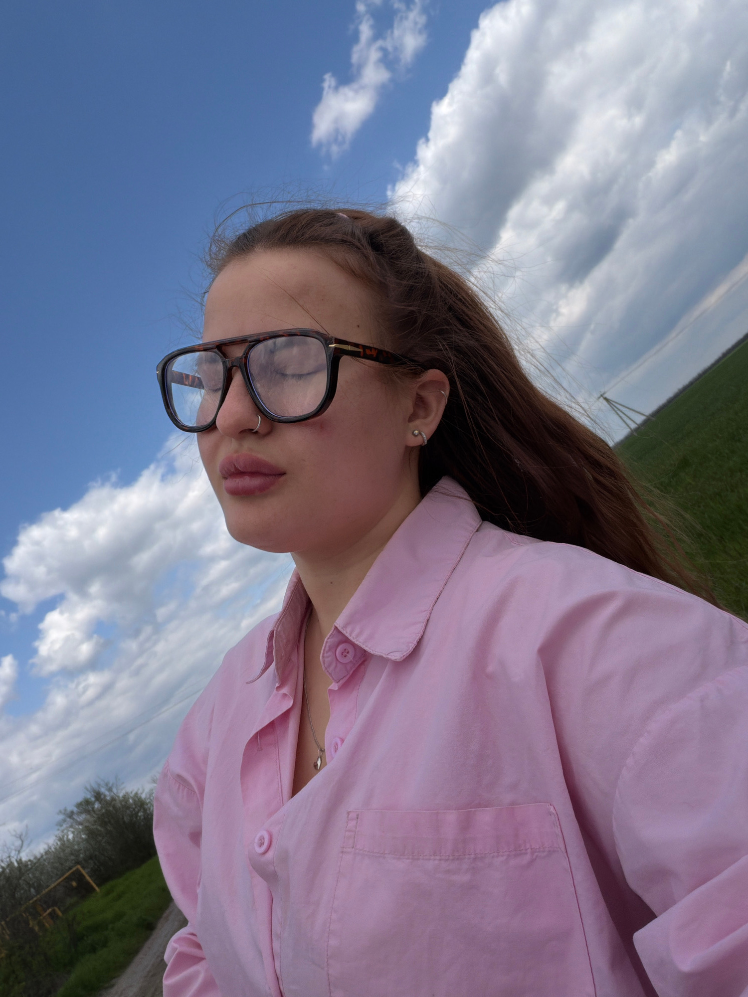 A rotated, upward-angled photo captures a young person, likely female, outdoors under a bright blue sky with scattered white cumulus clouds. The subject occupies the right and center of the frame, pos…read more
