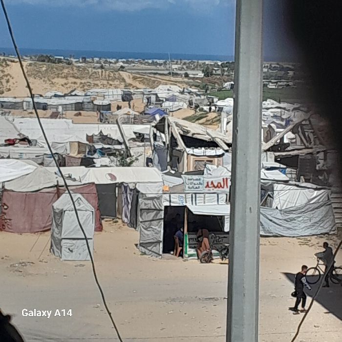 This image presents an elevated, wide view of a densely populated, makeshift settlement situated in Khan Yunis, Palestinian Territory, under bright daylight. A light-colored dirt road or path traverse…read more