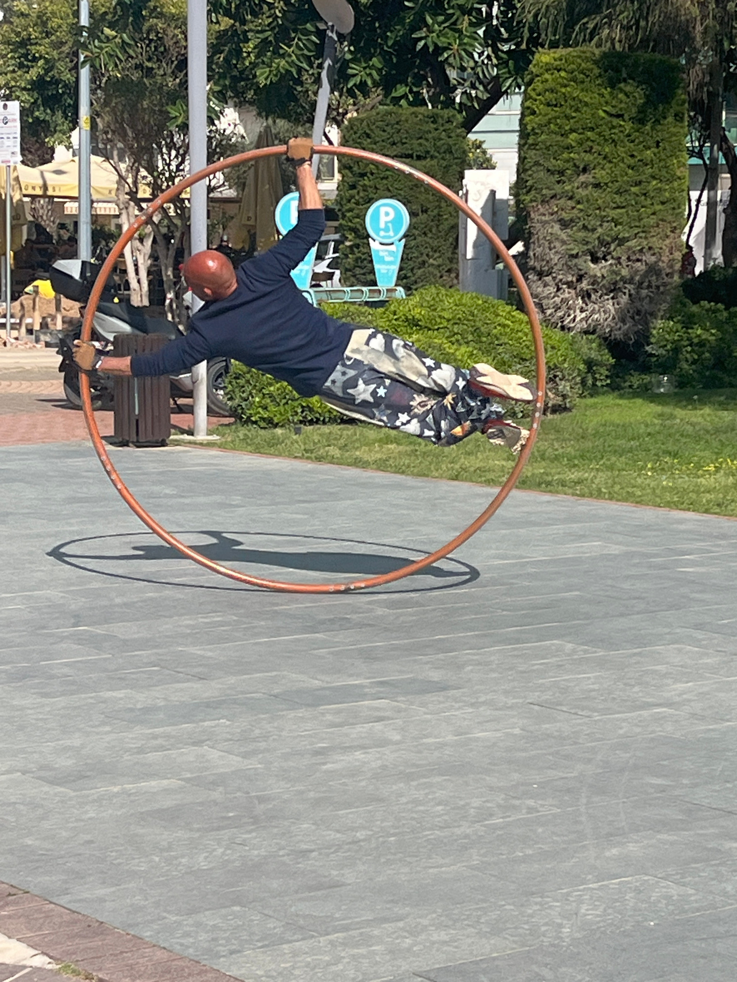 A man is performing inside a large metal hoop on a paved area in Alanya, Turkey. He is wearing a long-sleeved dark blue shirt, patterned pants, and brown gloves. The man is positioned inside the hoop,…read more