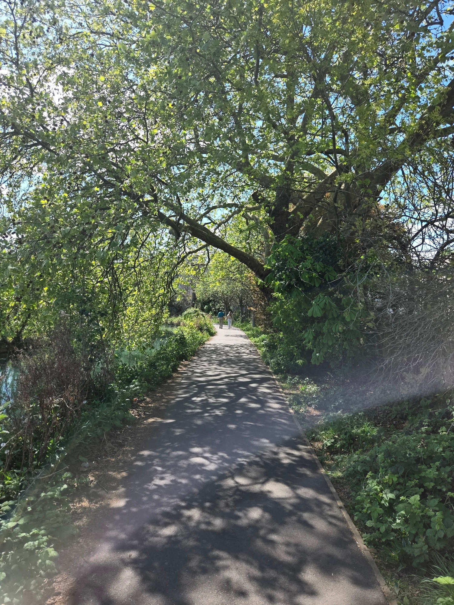 A paved path runs between trees and vegetation. The path is dappled with shadows from the trees. Two people are walking in the distance. The location is potentially in a park or green space in London,…read more