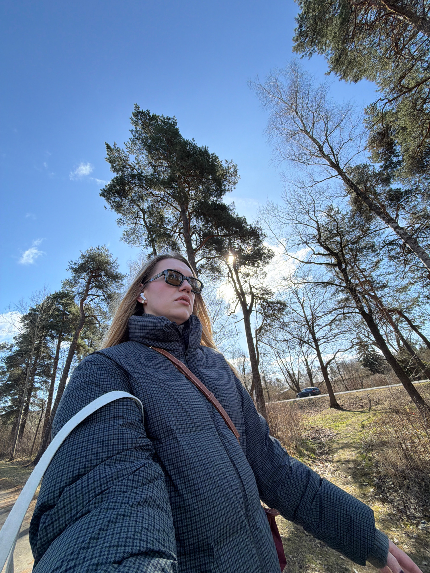 A low-angle, outdoor shot depicts a person in Riga, Latvia, identified as female, wearing sunglasses, a dark checkered jacket, and an earbud, looking upwards. The background features tall trees agains…read more