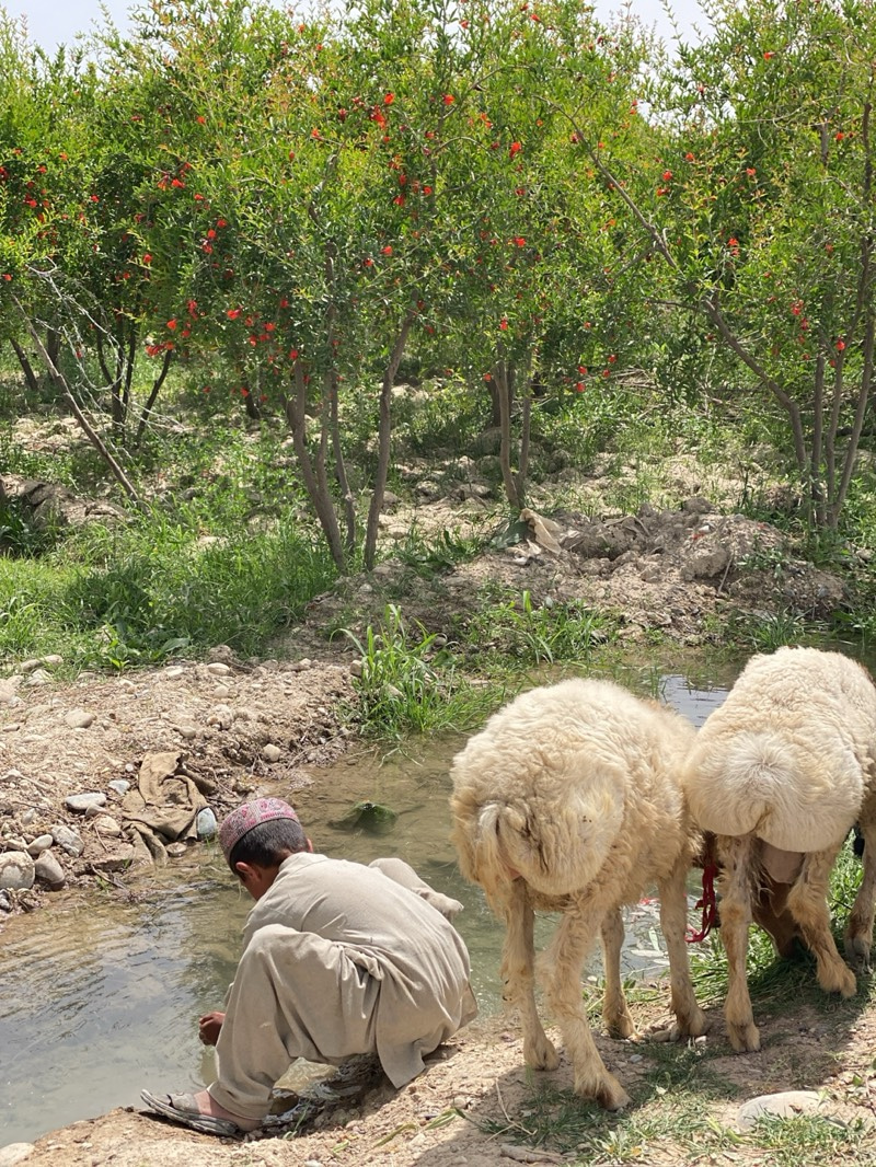 The image captures a rural outdoor scene, likely an orchard or agricultural area in Deh Sabzi, Afghanistan, under bright daylight. The foreground features a young boy or man, dressed in light-colored…read more