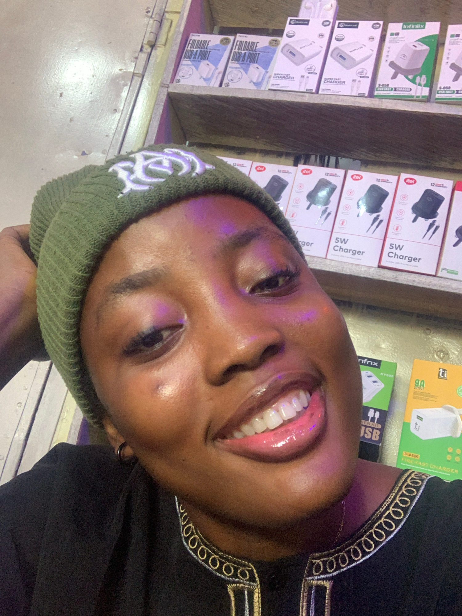 A close-up, rotated image shows a young Black person with a green beanie featuring a white logo. The individual is smiling, revealing their teeth, and appears to be indoors. The backdrop consists of s…read more