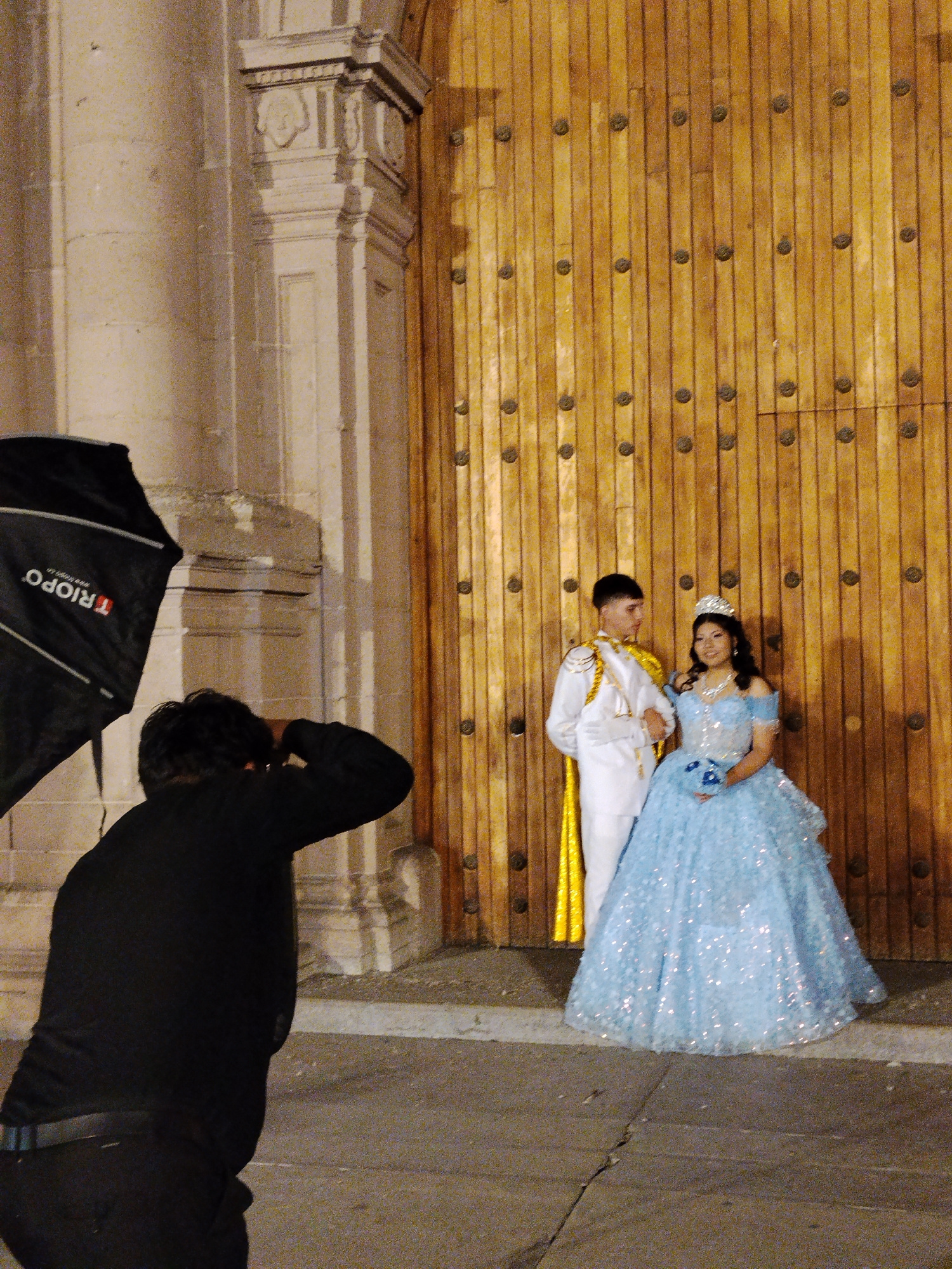 The image captures a photographer in the act of taking a picture of a young couple dressed in formal attire outside of the Cathedral of Tacna. The young woman is wearing a sparkling blue ball gown wit…read more