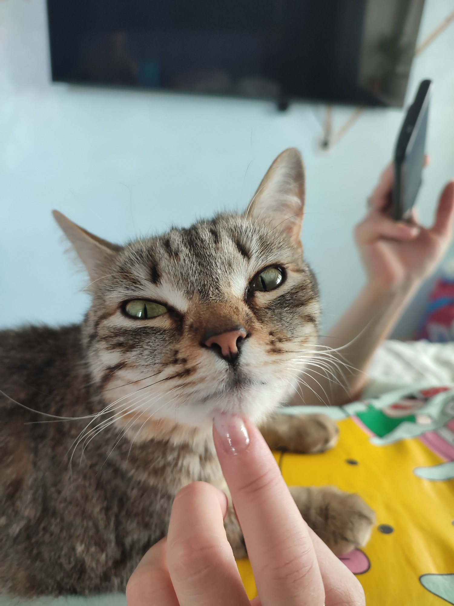 This close-up, eye-level indoor photograph, taken in Chaikovsky, Russia, centers on a tabby cat with striking green eyes. The cat's fur displays a mix of brown, grey, and white stripes, and it has a l…read more