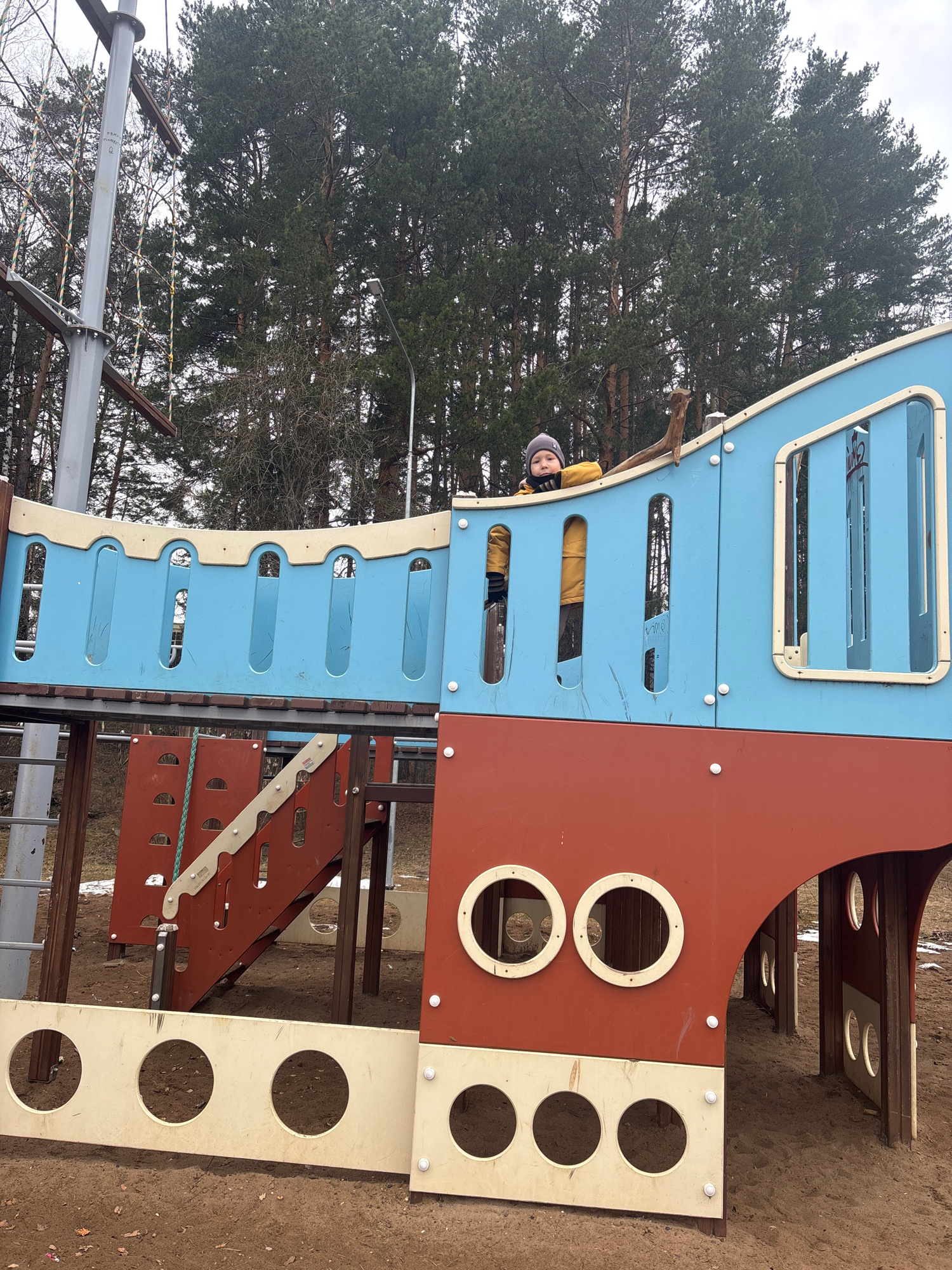 A young child wearing a yellow jacket and grey hat looks out from the blue section of a playground structure. The structure has a combination of blue and reddish-brown paneling with white circular cut…read more