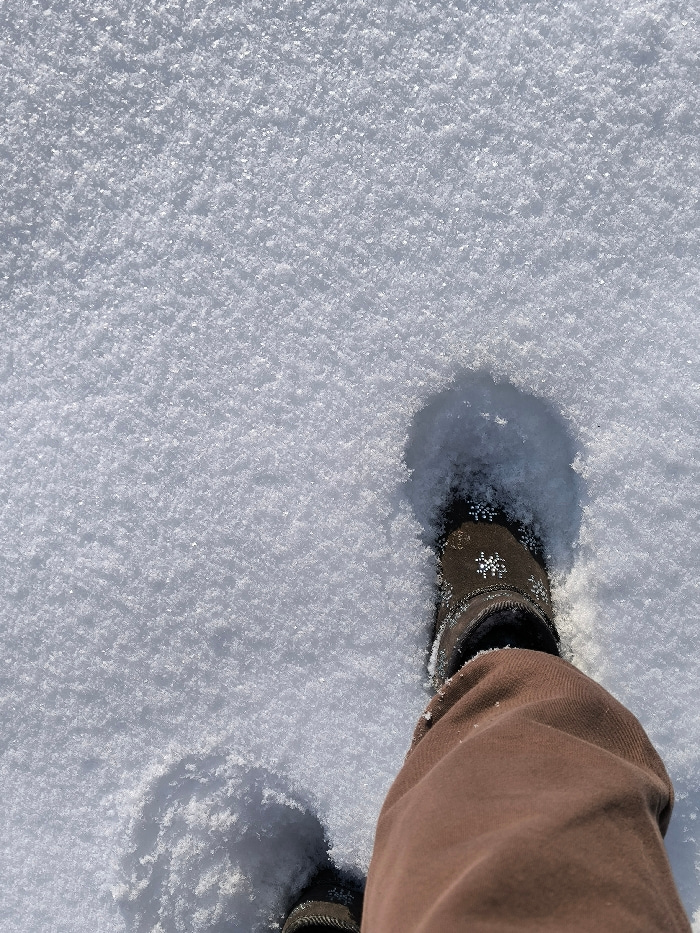 A downward-angle photograph, taken in Parkhomivka, Ukraine, depicts the lower legs and feet of an individual standing in a field of pristine, crystalline snow. The snow surface glistens, suggesting di…read more