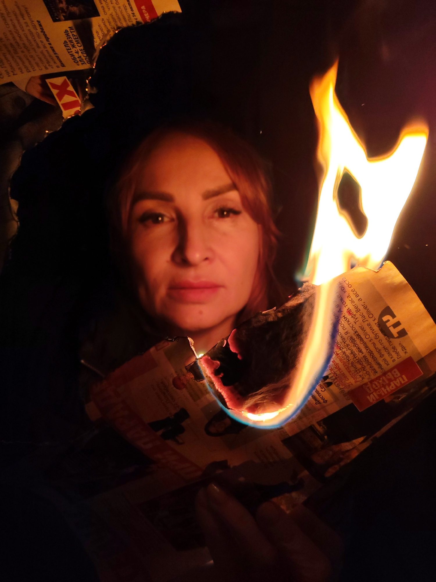 A woman with reddish-brown hair is looking directly at the camera, holding burning newspaper. The newspaper has Russian text, including the words "ПАРНЫЙ ВЫХОД" and references to "s.Oliver" and "Лас-В…read more