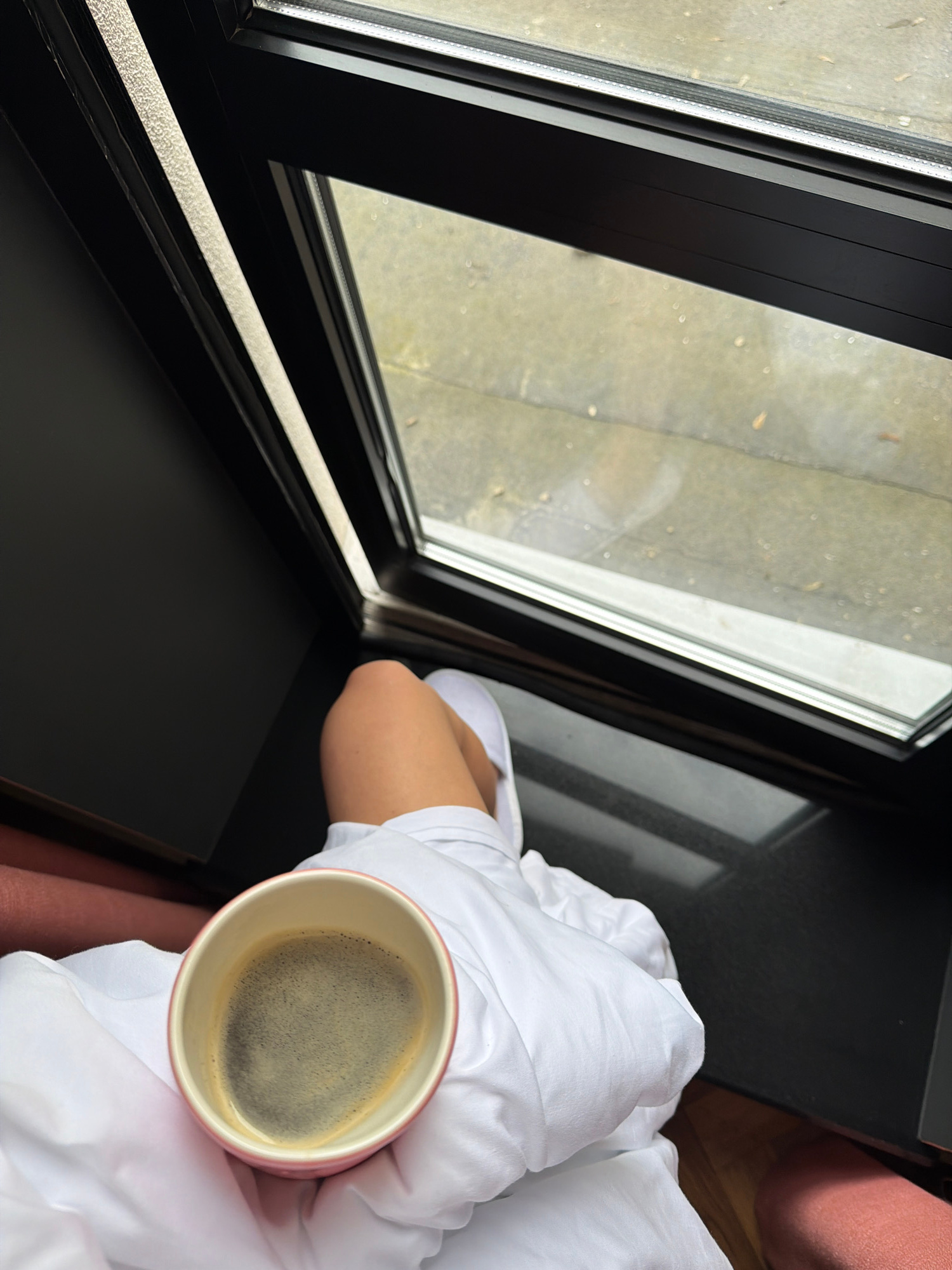 A high-angle shot shows a person holding a pink mug of coffee while sitting near a window. The window has a black frame and shows an outside view of a gray concrete surface. The person is covered in a…read more