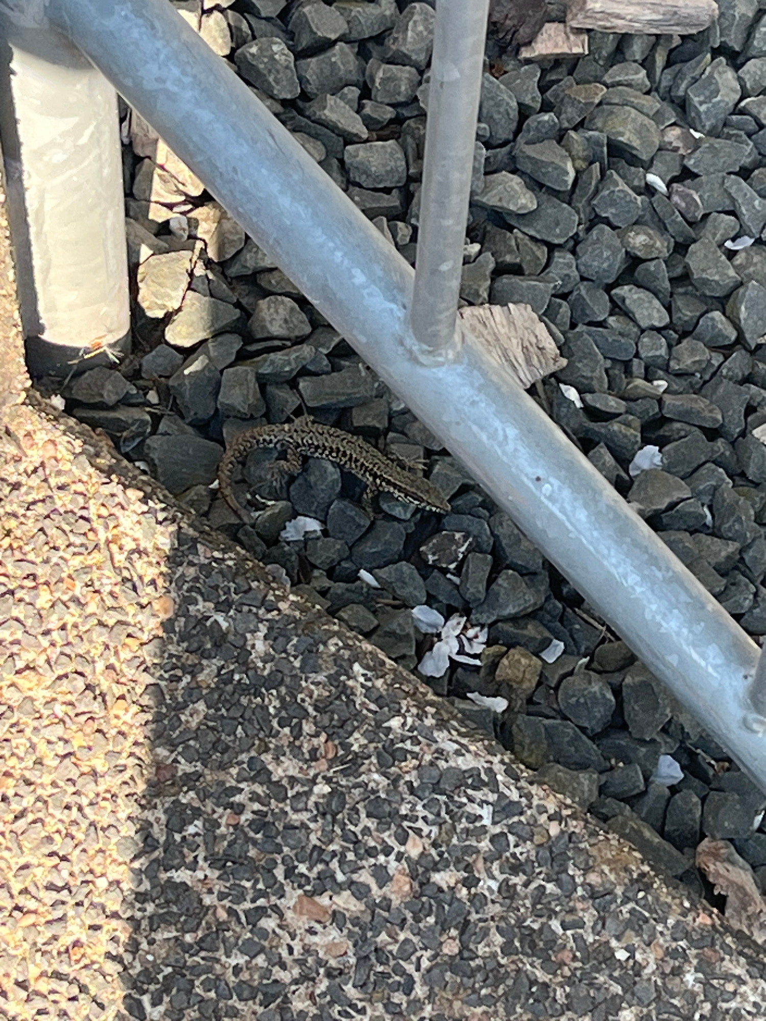 A ground-level photograph taken in an outdoor setting. A grey metal bar runs diagonally across the image, from the lower-left to the upper-middle. Beneath the bar, there's a bed of small, grey rocks iā¦read more
