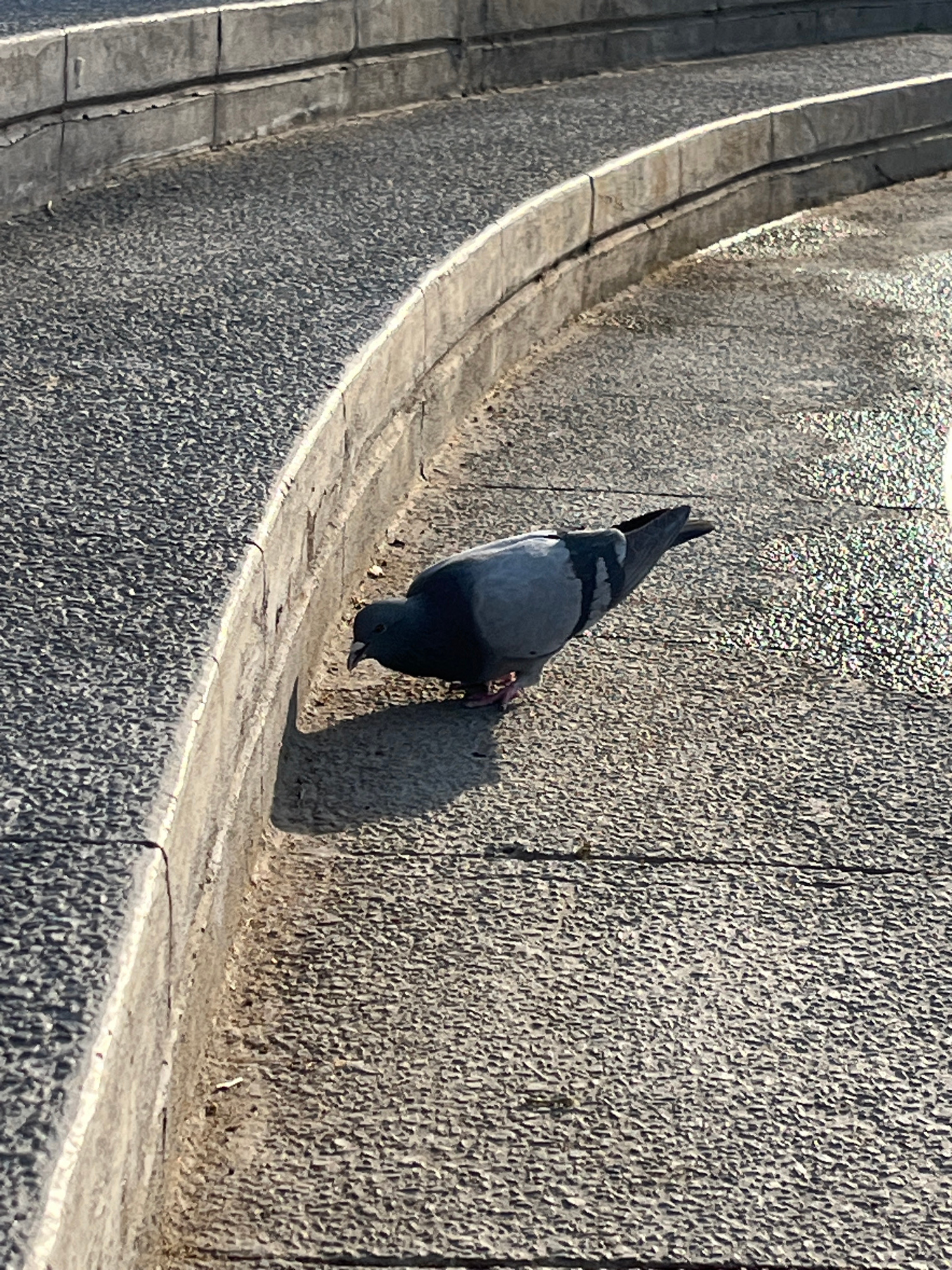 A pigeon is eating from a concrete structure. The pigeon is mostly gray and black with a small amount of red at the neck. The structure is gray and appears to be an edge or wall. The image is taken ou…read more