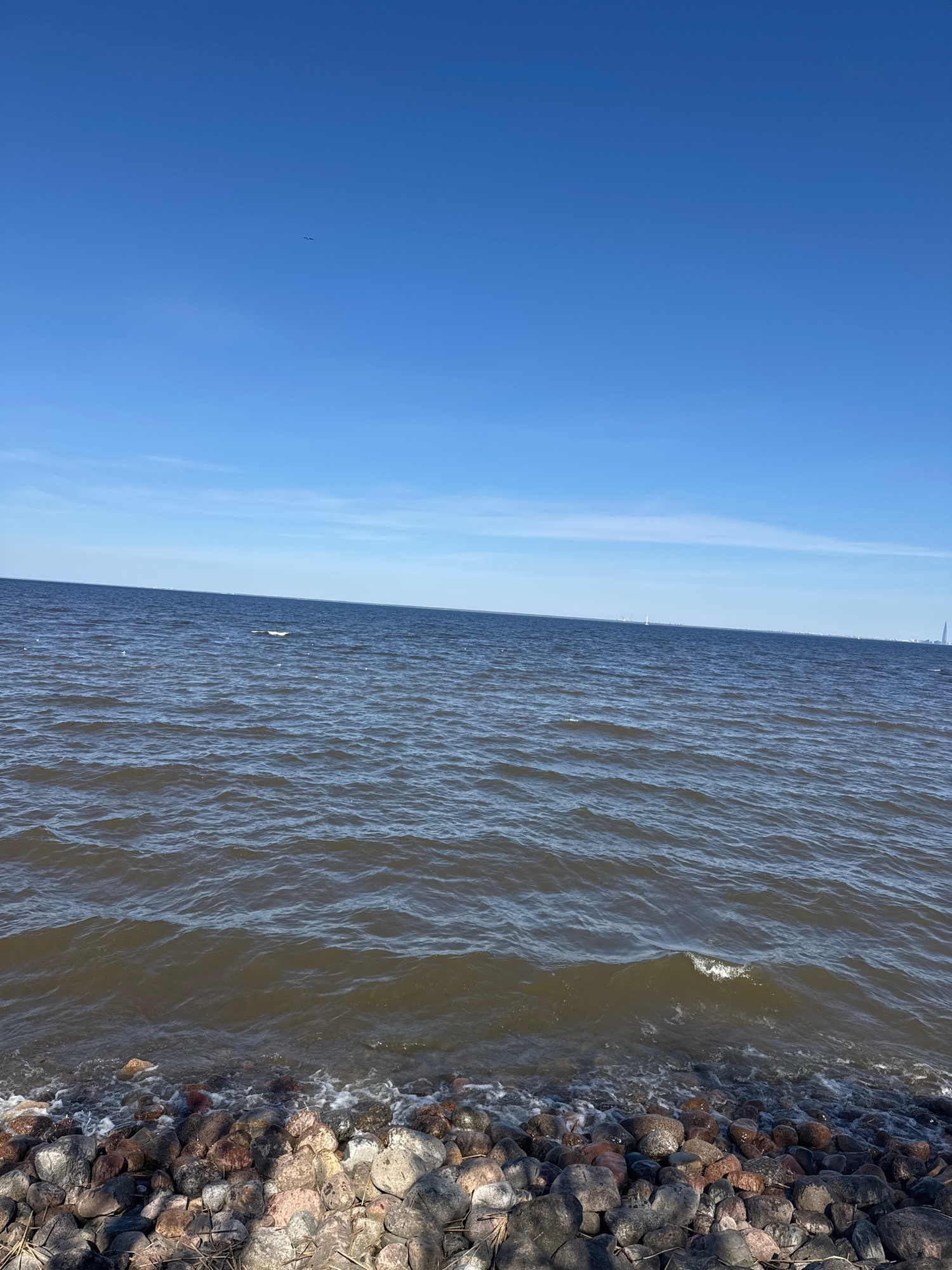 This image, when correctly oriented, presents a serene landscape featuring a vast body of water meeting a rocky shore under a clear sky. The horizon line distinctly divides the scene, with the sky occ…read more