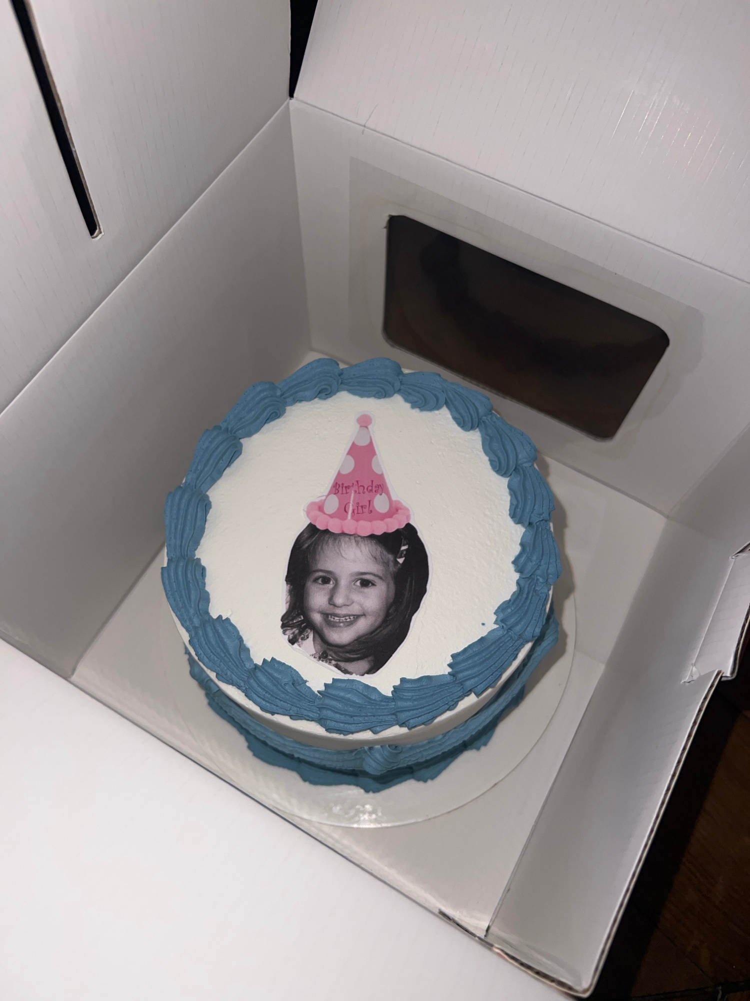 The image shows a cake in a white cardboard box. The cake is round, with white frosting and a blue decorative border. A black and white photograph of a young girl wearing a party hat is centered on th…read more