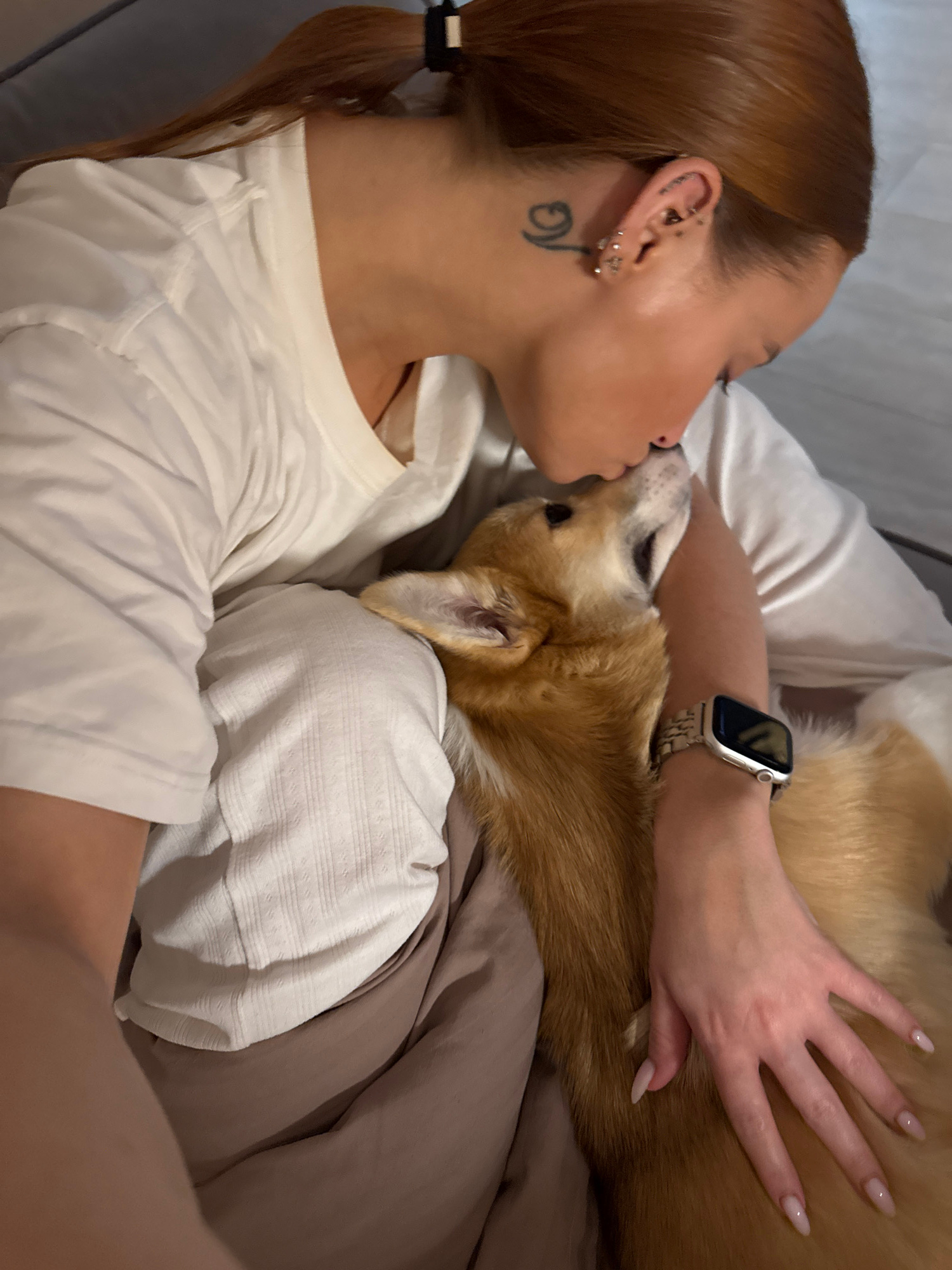A woman with auburn hair in a low ponytail and a tattoo on her neck is lying down next to a corgi dog. She appears to be kissing the dog’s head, and her hand is resting on the dog’s body. The woman is…read more