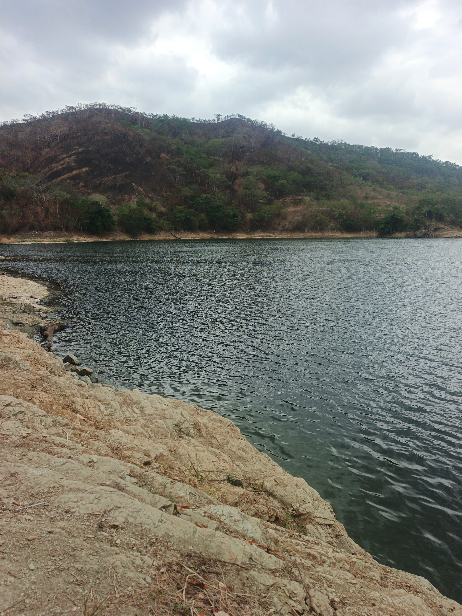 The image depicts a lake or reservoir situated in a natural environment under an overcast sky. The foreground is dominated by a rocky shoreline with light brown, layered rock formations. The water is…read more