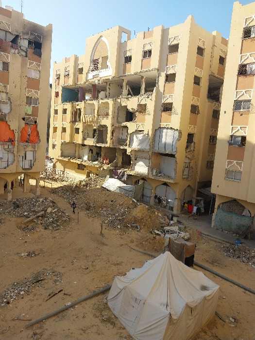 This image depicts a severely damaged urban residential area in Khan Yunis, Palestinian Territory, under a clear, light blue sky. Three multi-story, light-tan residential buildings, each featuring dec…read more
