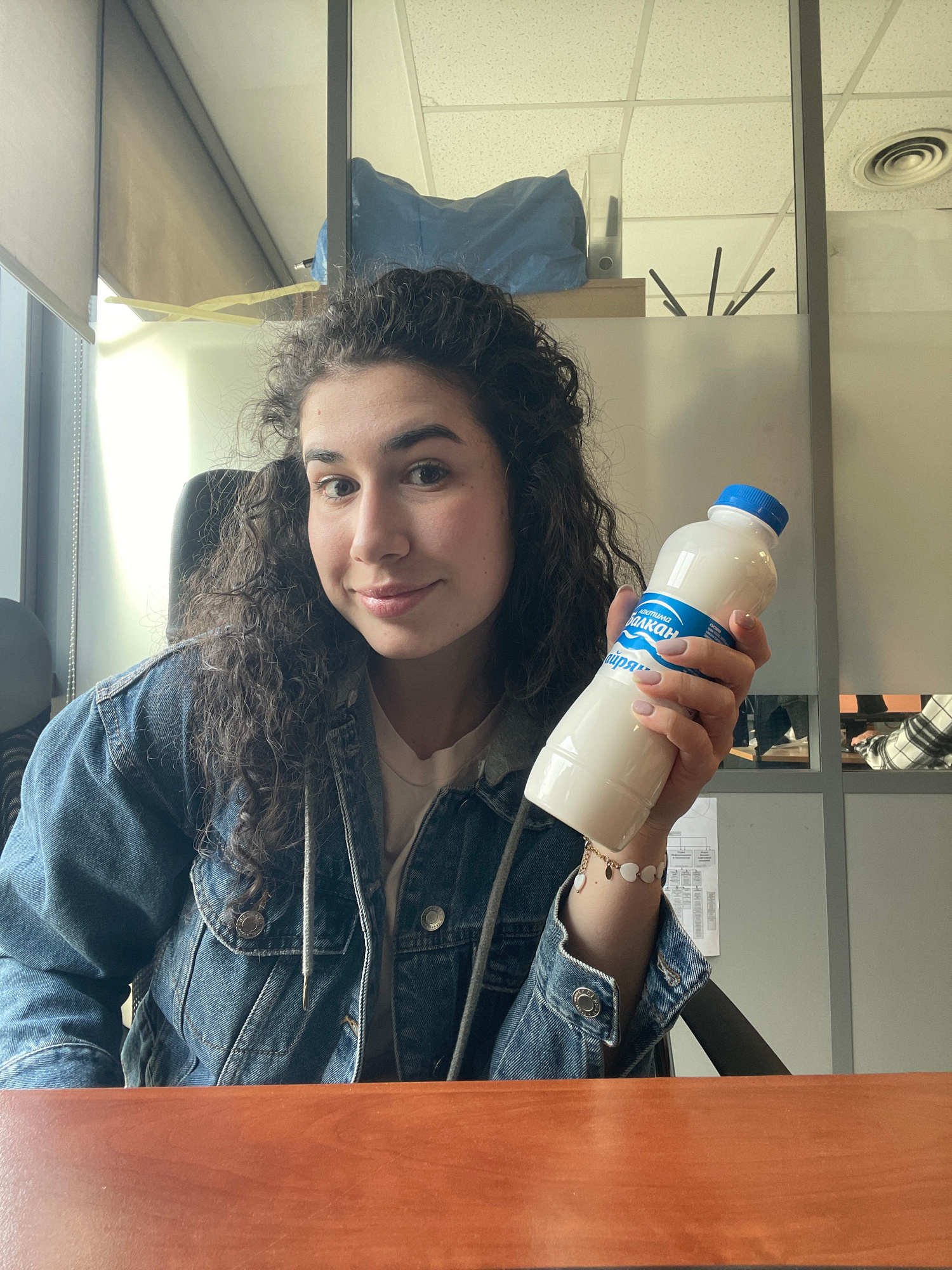 A person with dark curly hair, wearing a denim jacket and a bracelet, is holding a white plastic bottle with a blue label and cap. The label appears to be in Cyrillic script. The setting appears to be…read more