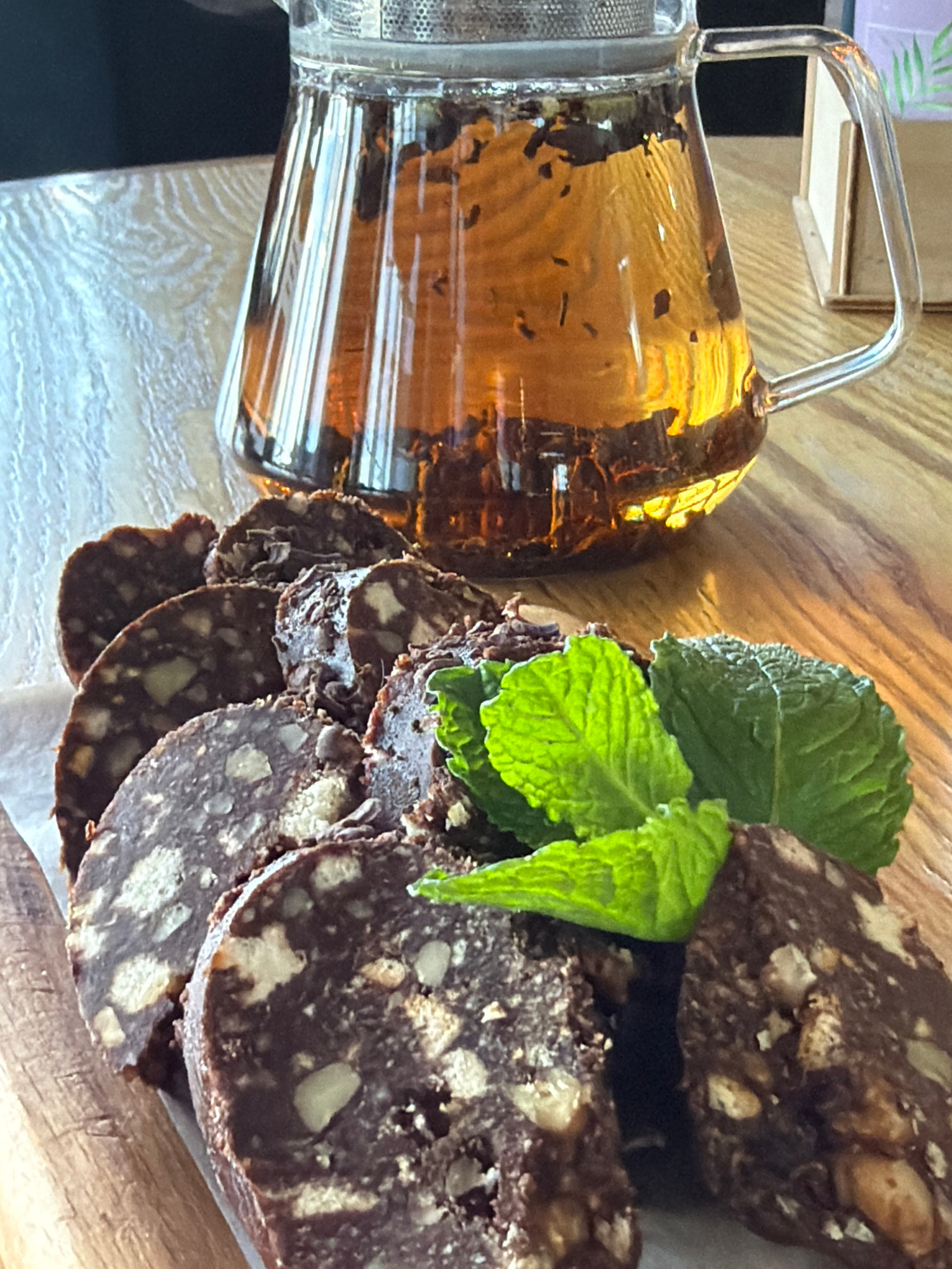 The image captures a close-up, top-down view of a glass teapot filled with amber-colored tea, alongside several slices of a chocolate dessert, arranged on a light-colored wooden surface. The teapot,…read more