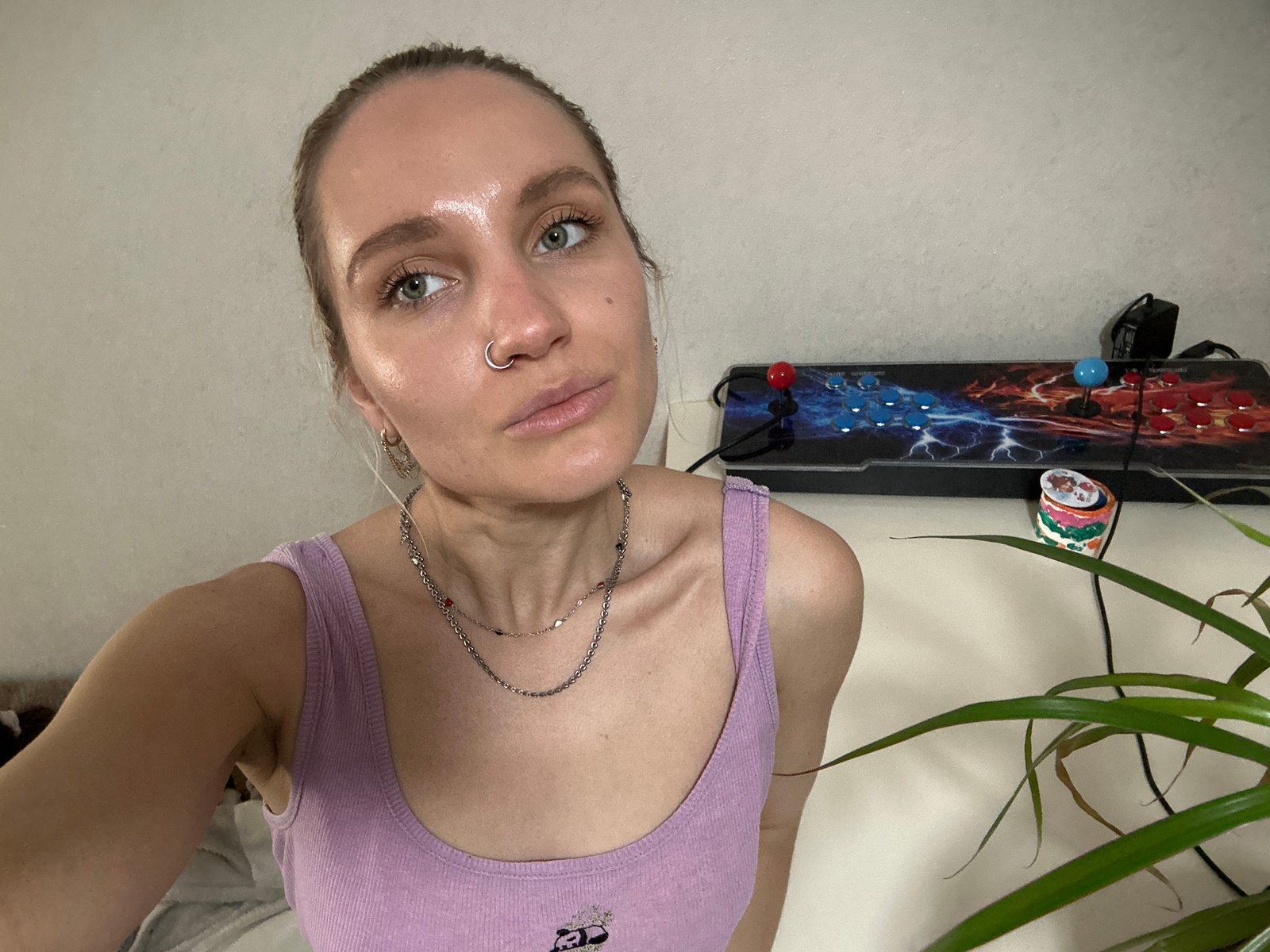 An upright-oriented, close-up indoor shot features a young woman with light skin, green eyes, and a neutral expression, looking directly at the camera. She has a silver septum piercing and wears a ligβ¦read more