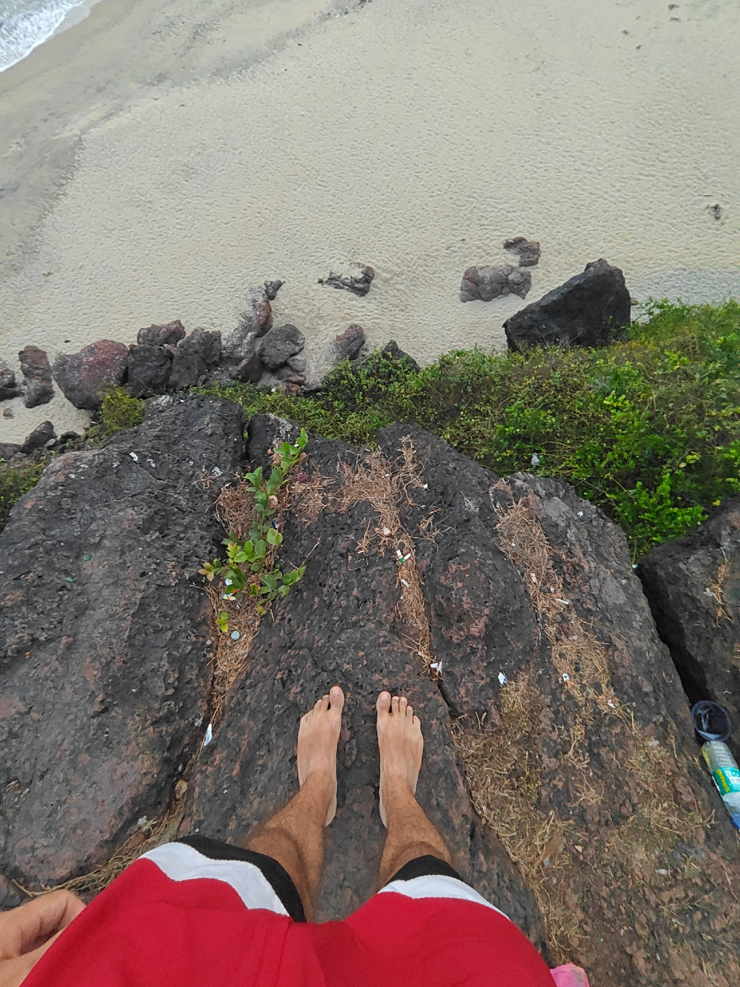 The image shows a first-person, overhead perspective of a person standing barefoot on a rocky cliff, presumably in Querim, India, overlooking a sandy beach and the ocean. The person is wearing red sho…read more