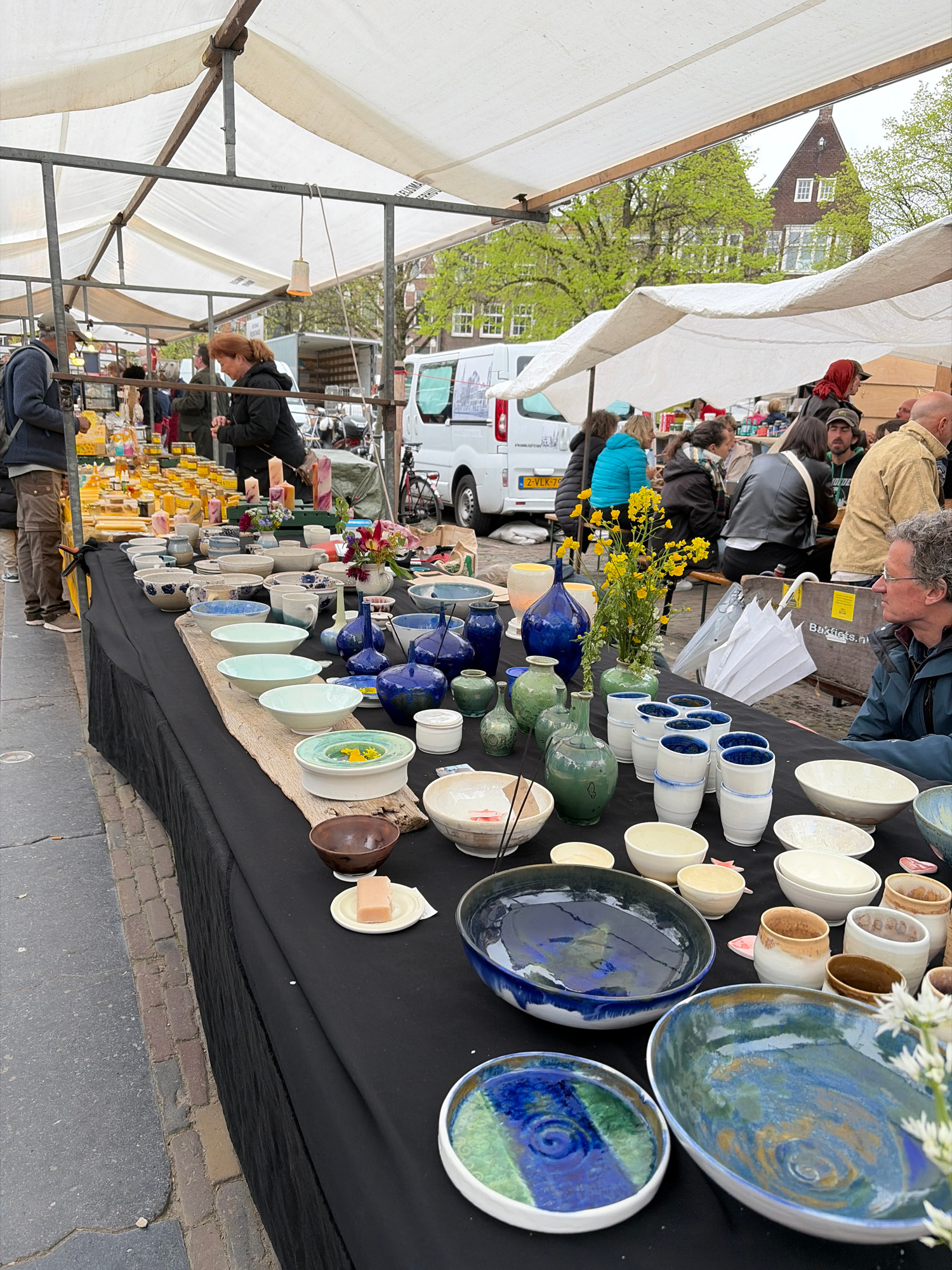 A low-angle, eye-level outdoor shot depicts a street market with ceramic items displayed on a long black table. Several individuals are seen browsing the items or interacting with the vendors. The tab…read more