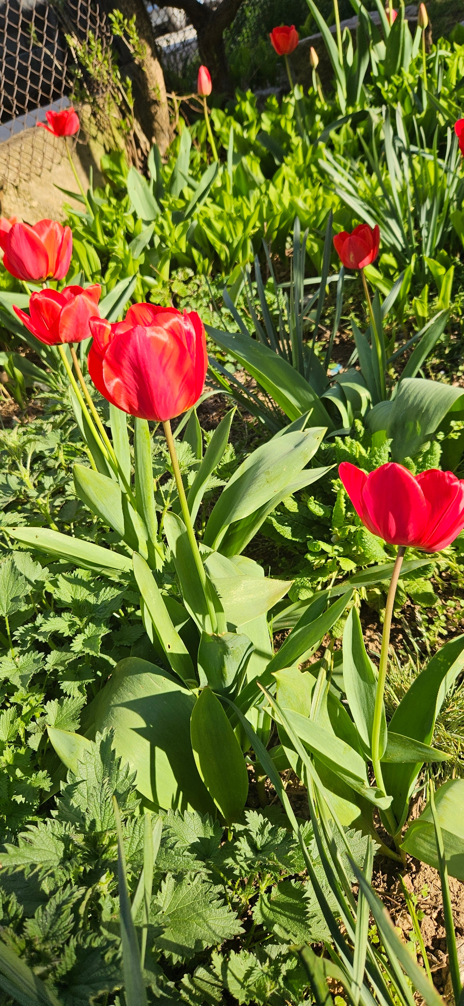 A close-up, angled ground-level shot depicts a patch of red tulips blooming among dense green foliage, potentially in a garden or naturalized area. The flowerheads are fully opened and a vibrant red,…read more