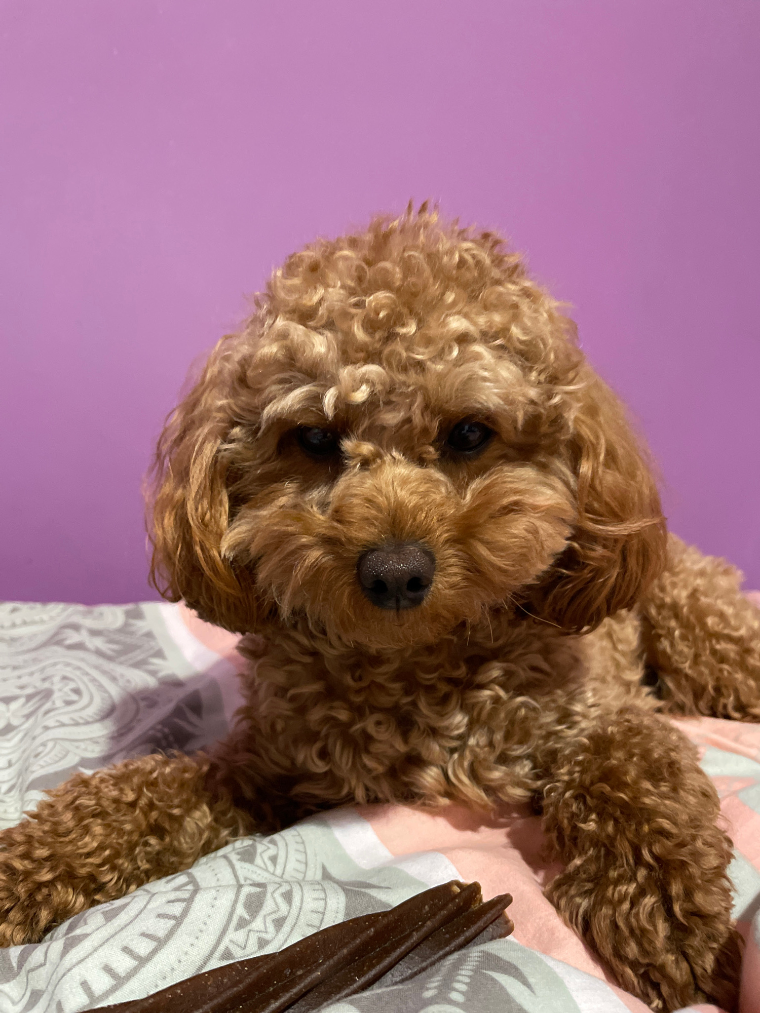 A close-up shot of a brown poodle dog. The dog is positioned on a patterned pink, gray, and white blanket against a solid purple background. The dog's face is prominent, with focus on its eyes and nos…read more