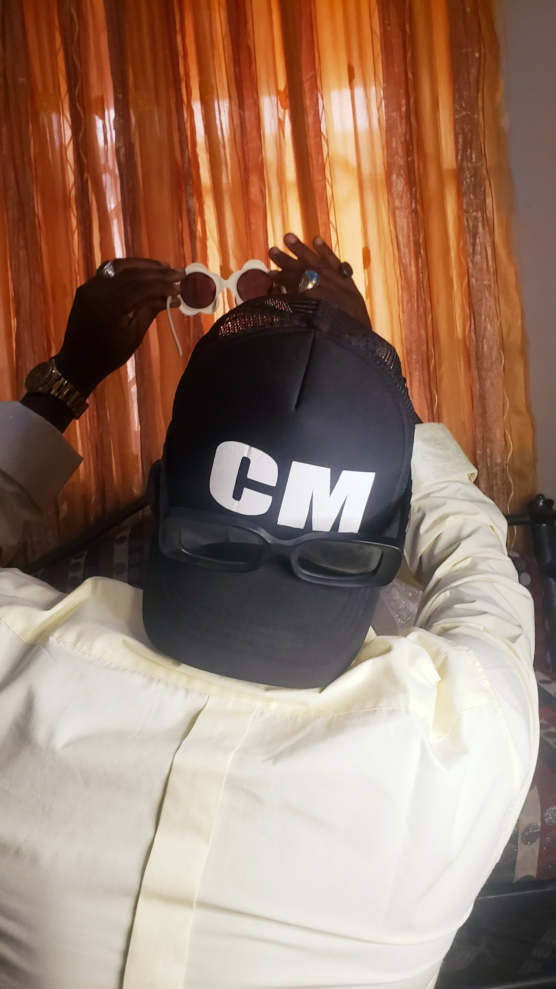 A person wearing a white shirt and a black cap with the letters "CM" in white is holding up a pair of sunglasses with red lenses and white frames in front of a brown and orange striped background. Theβ¦read more