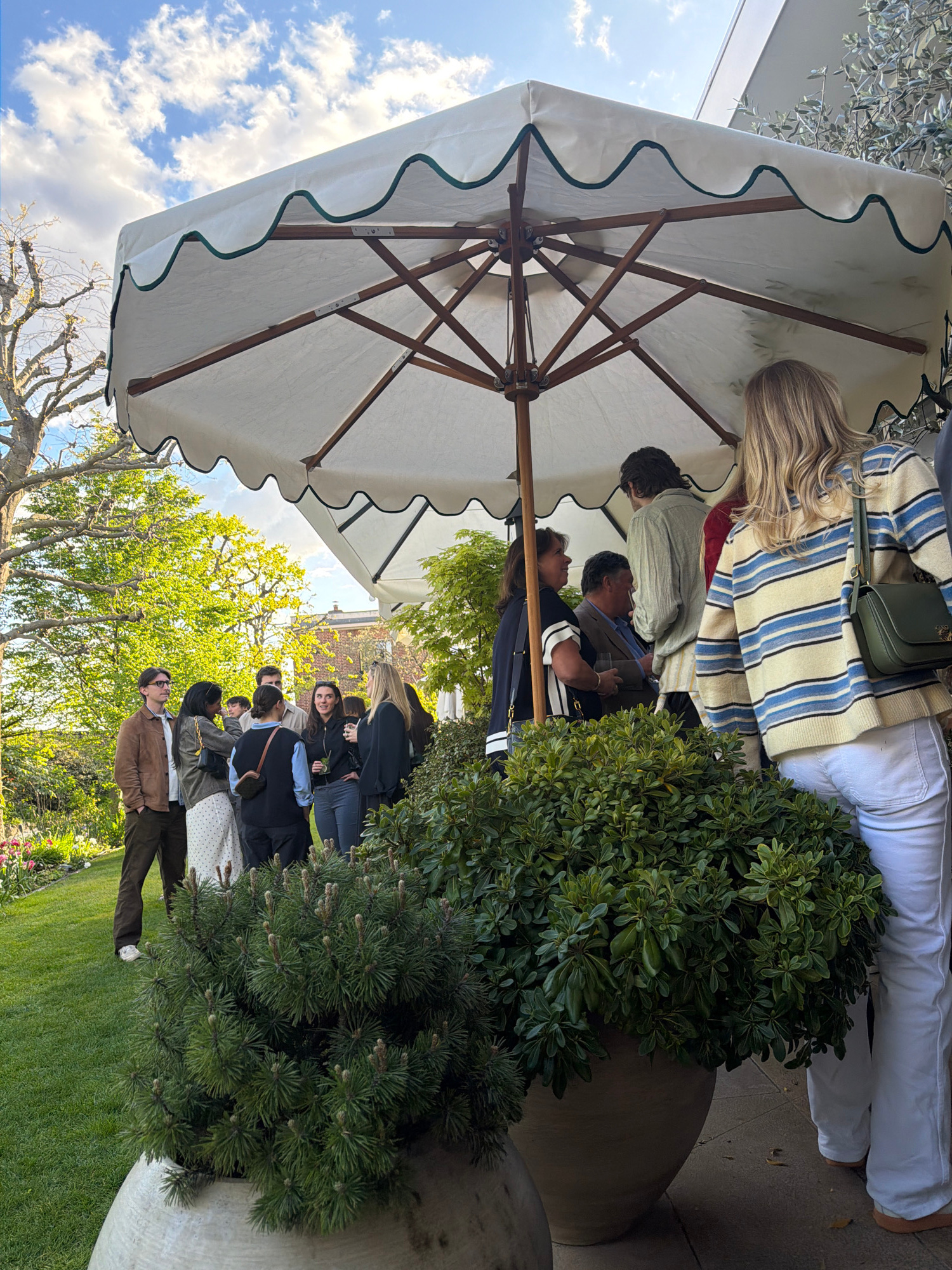 A group of people is gathered outdoors, possibly at a public event or gathering. The location is possibly in London, UK. There is a large white umbrella with a scalloped edge providing shade. Several…read more